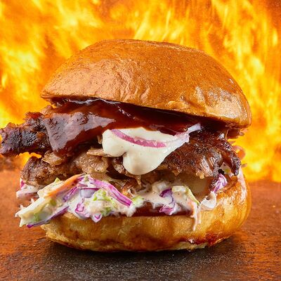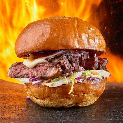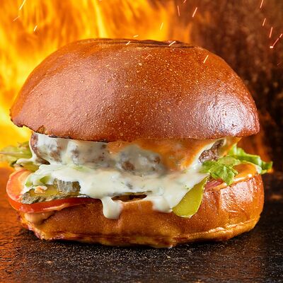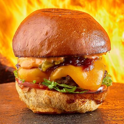 Домашняя булочка бриошь, котлета из мраморной говядины, салат айсберг, маринованный огурчик, соус на основе сыра дорблю, луковый конфитюр, фирменный соус