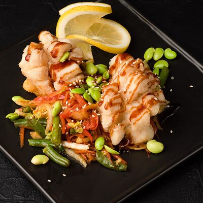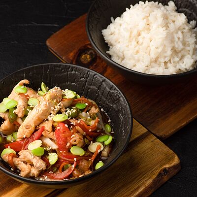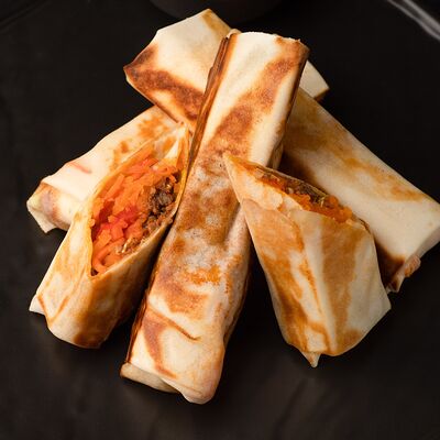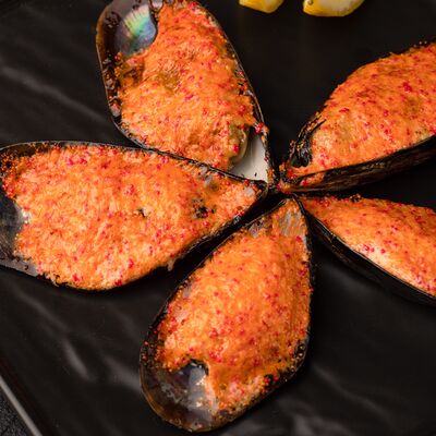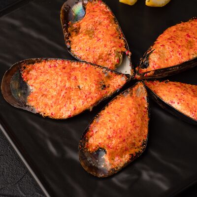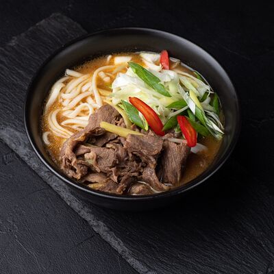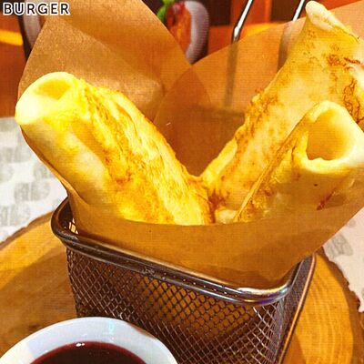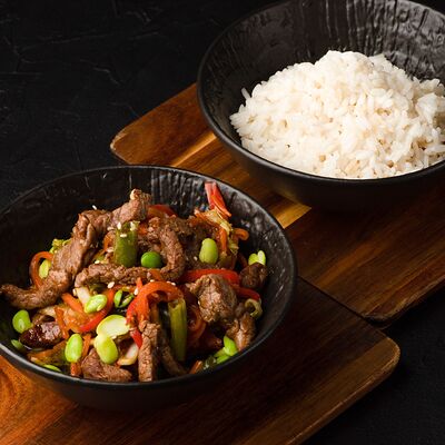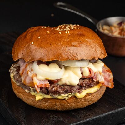 Пшеничная булка, бифштекс из мраморной говядины, соус сальса, тушеные бобы, бекон, хрустящий лук, сырный соус