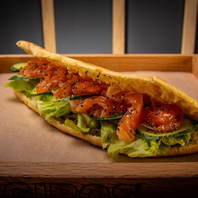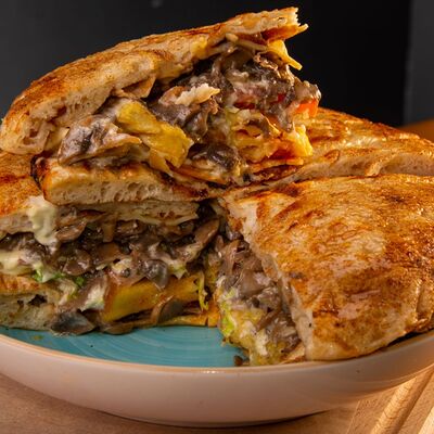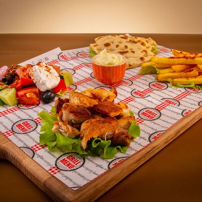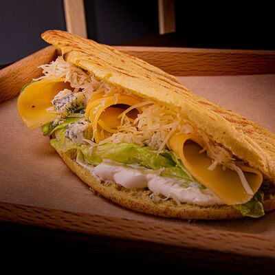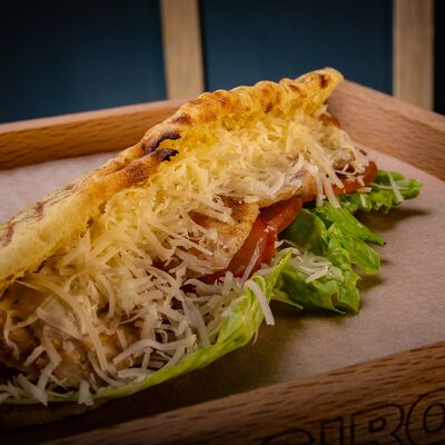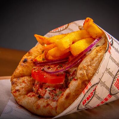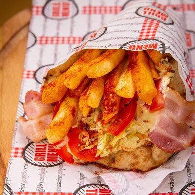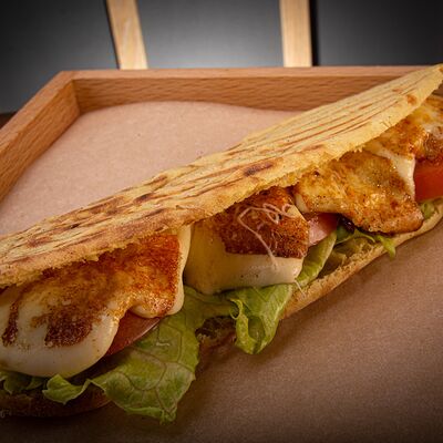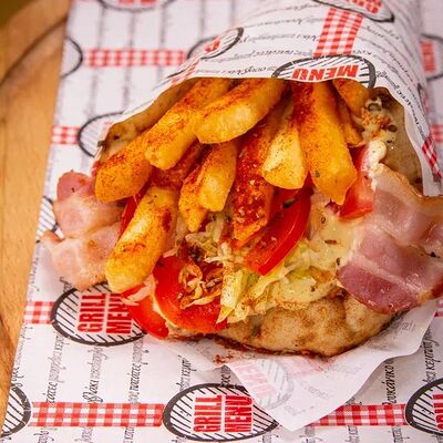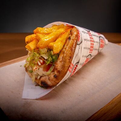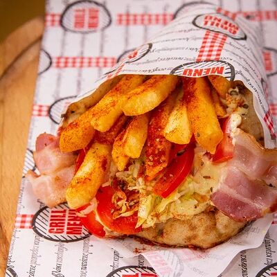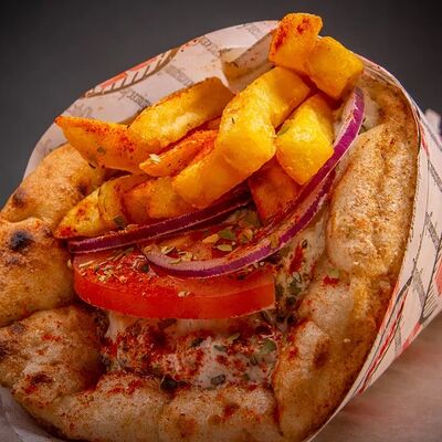 Пита, филе куриное, соус Мостарда, помидор, салат айсберг, картошка фри