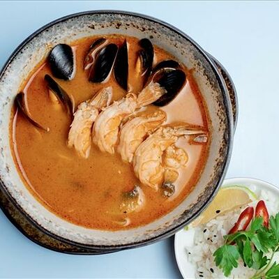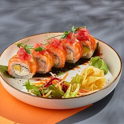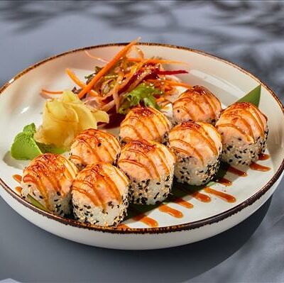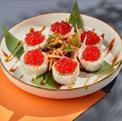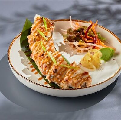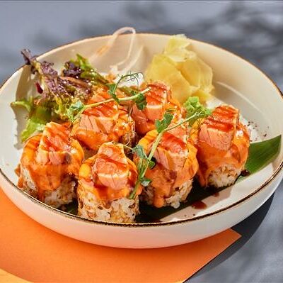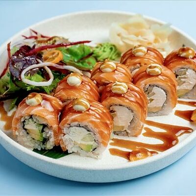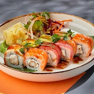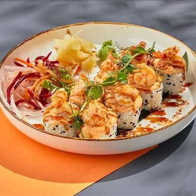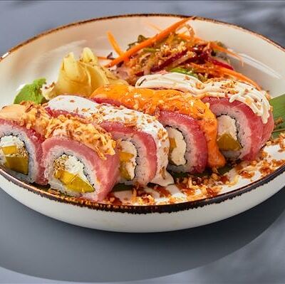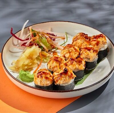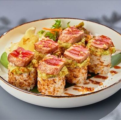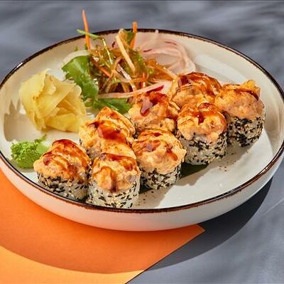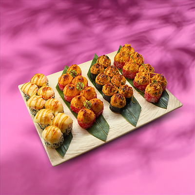 Темпура ролл лосось, угорь и соус манго (5шт.), Темпура ролл тунец и соус манго (5шт.), Темпура ролл креветка и соус Том Ям (5шт.), Кольца кальмара в кляре, Креветки в темпуре (3шт.) (в комплектацию блюда Не входят: соевый соус, имбирь, васаби)