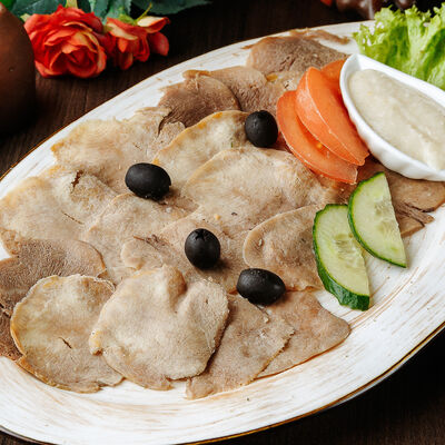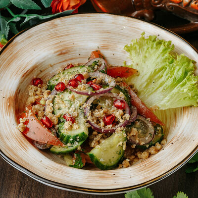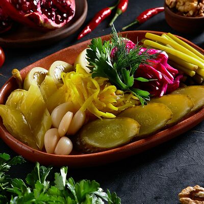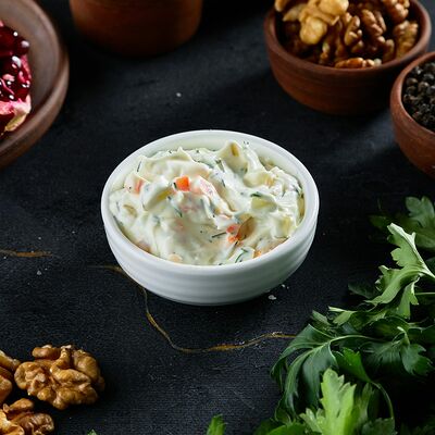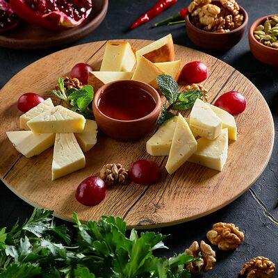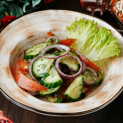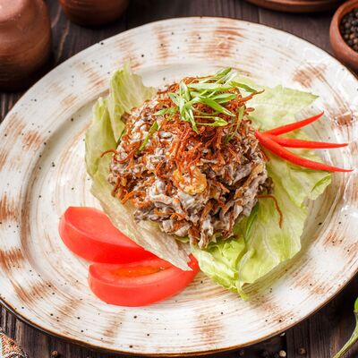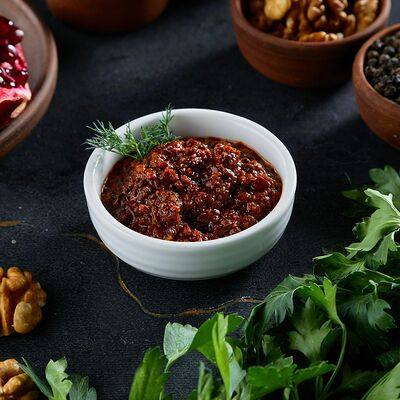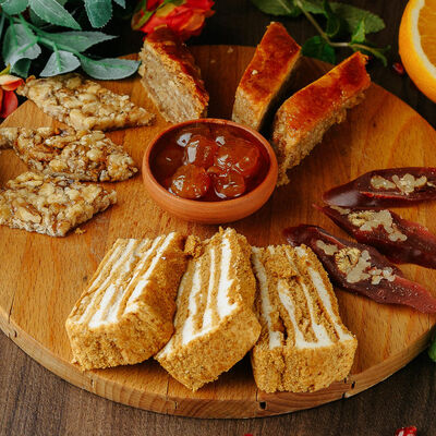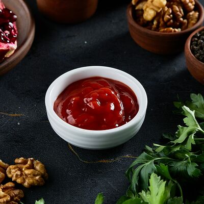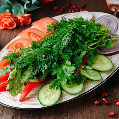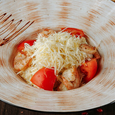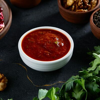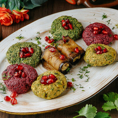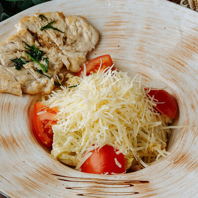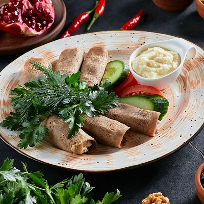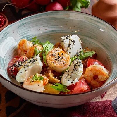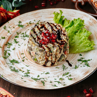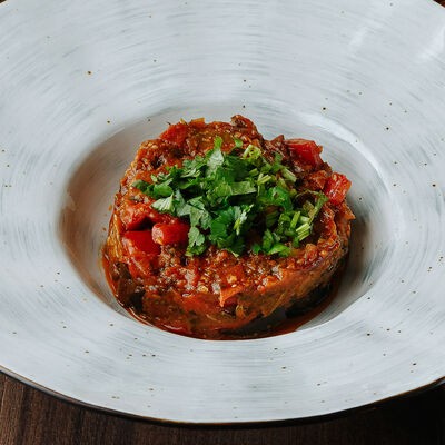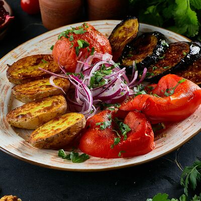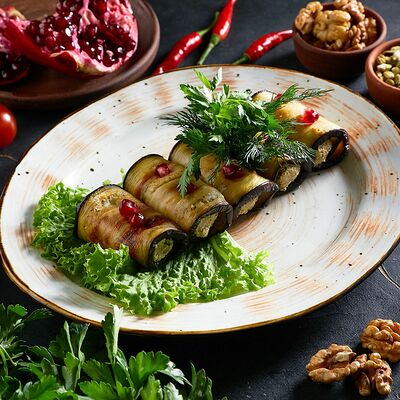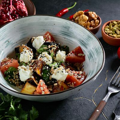 Помидоры, баклажаны, сливочный сыр, семечки подсолнечника, сладкий соус чили