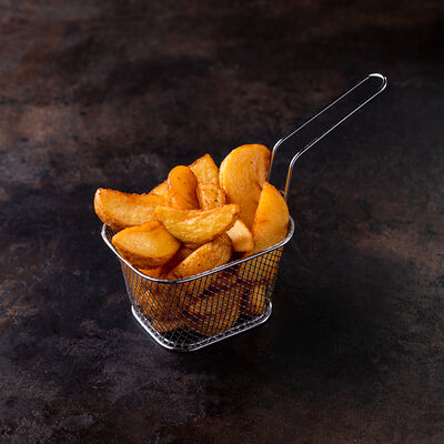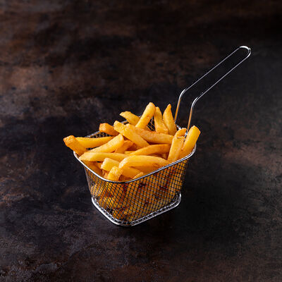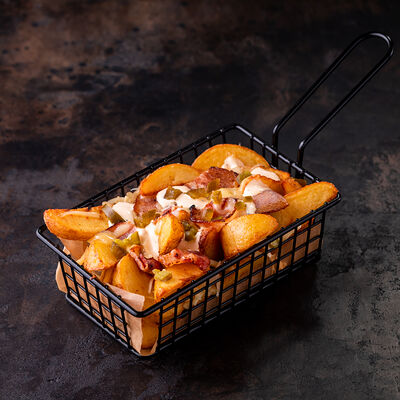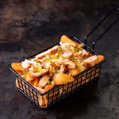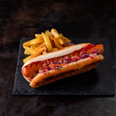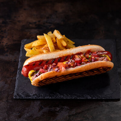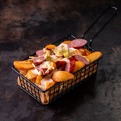 Картофель фри, сосиска из говядины, сыр тёртый, огурцы маринованные, соус Фирменный