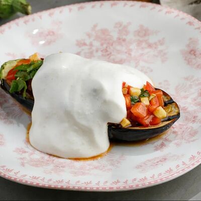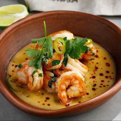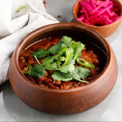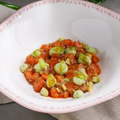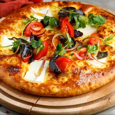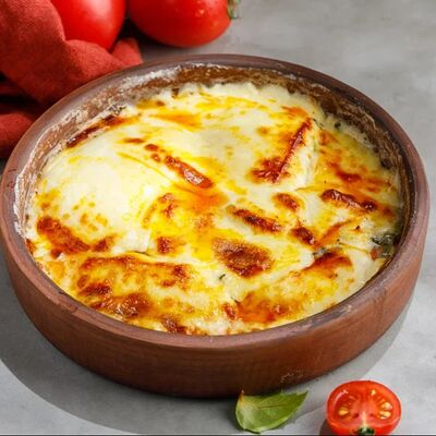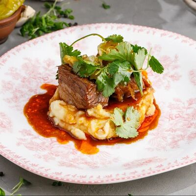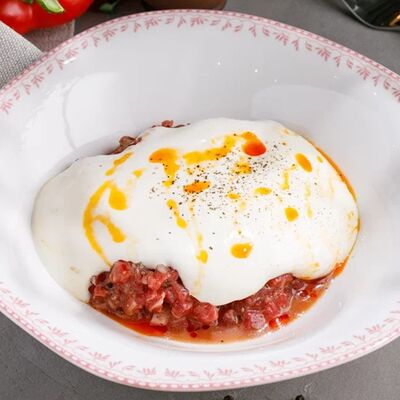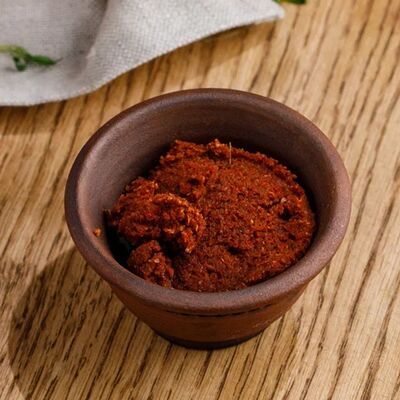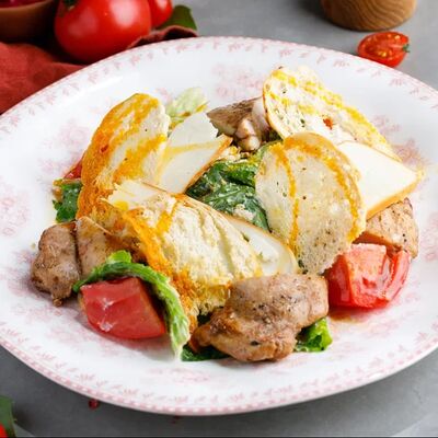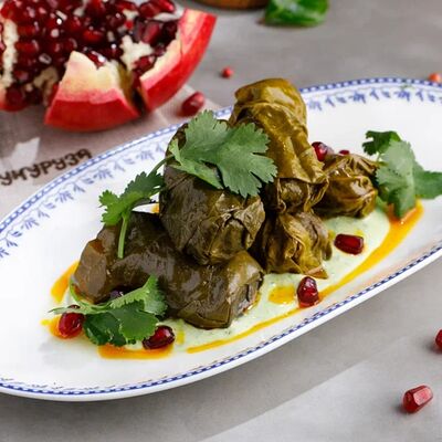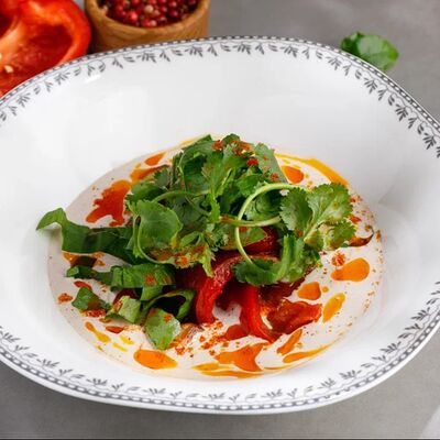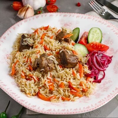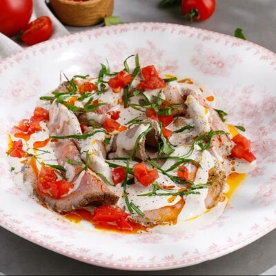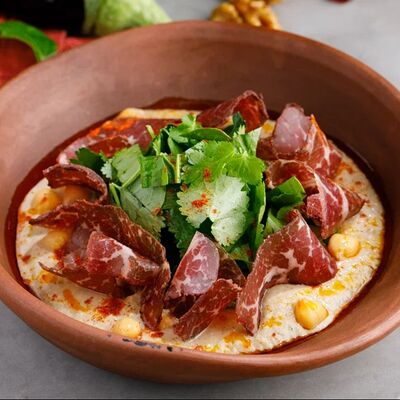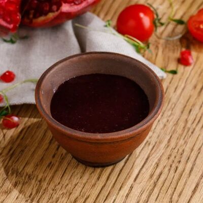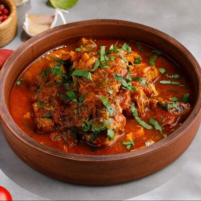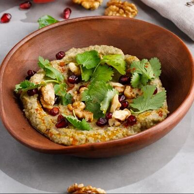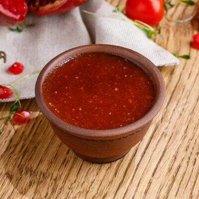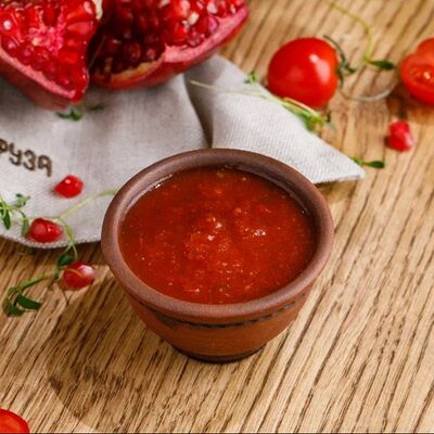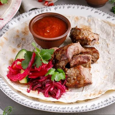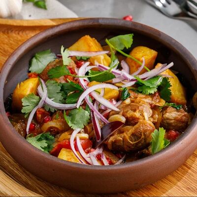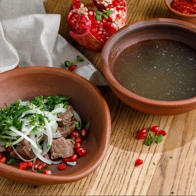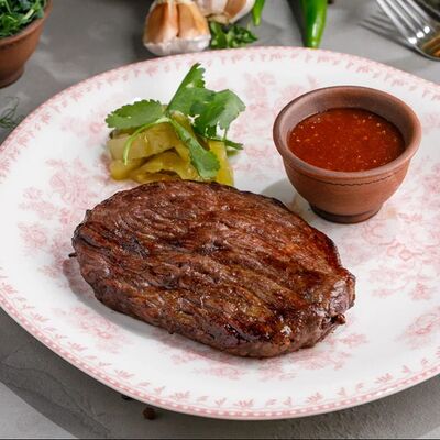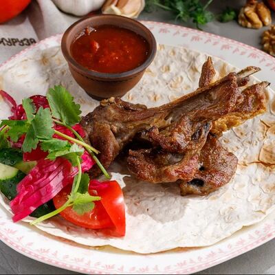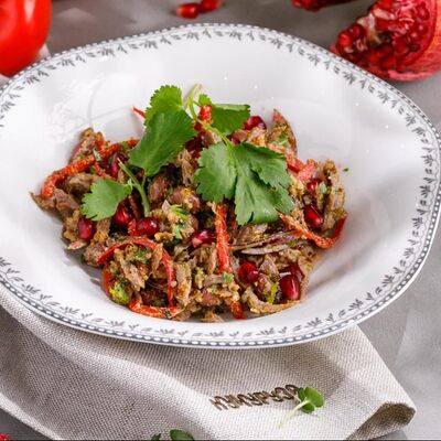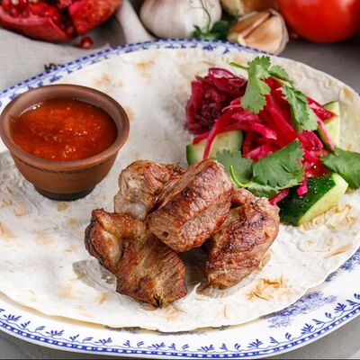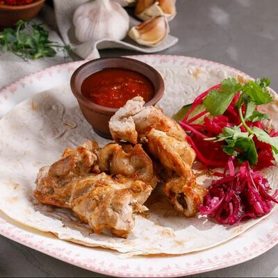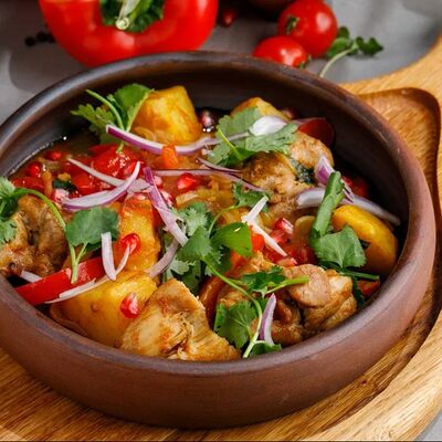 Кусочки куриного бедра приготовленные на мангале с обжаренным картофелем, паприкой, томатами, кинзой. Добавляется сванская соль, шереули. Посыпается свежим красным луком, зернами граната и свежей кинзой