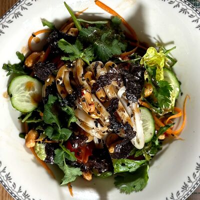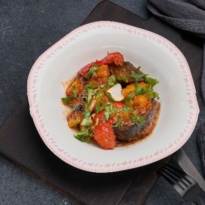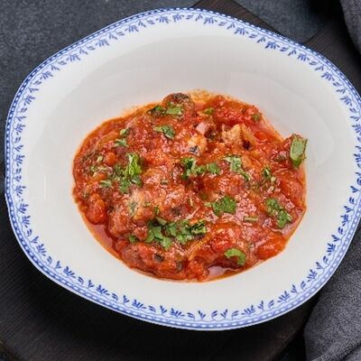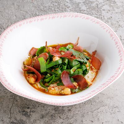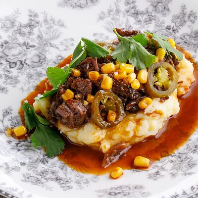 Говяжья грудинка тушеная, соус демиглас, пюре картофельное, халапеньо, кукуруза консервированная, кинза