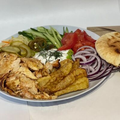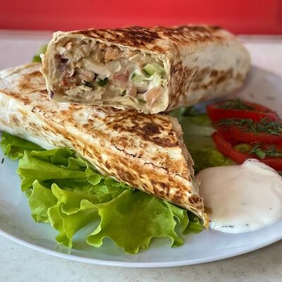 Куриное филе, помидор, огурец, морковка по-корейски, лук маринованный, капуста, картошка, грибы, соус фирменный, соус сырный, соус барбекю