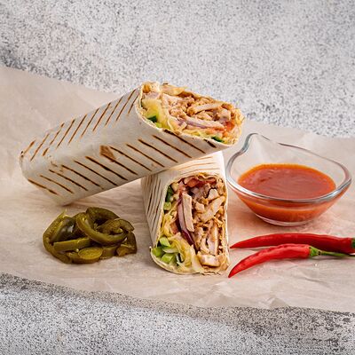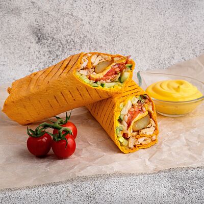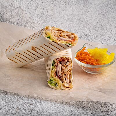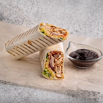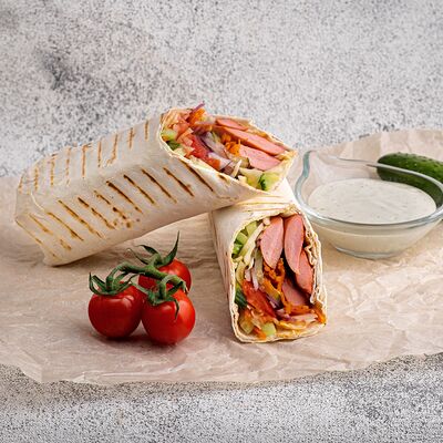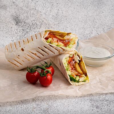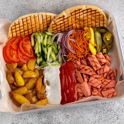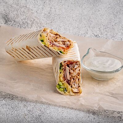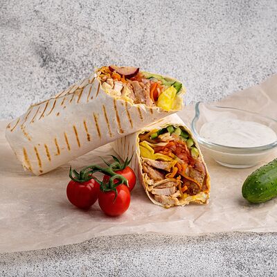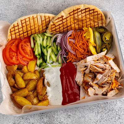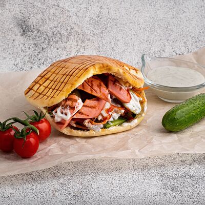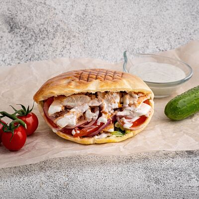 Курица, помидоры, огурцы, лук красный, соус чесночный, пита