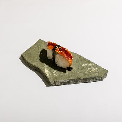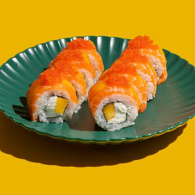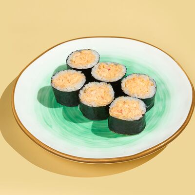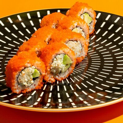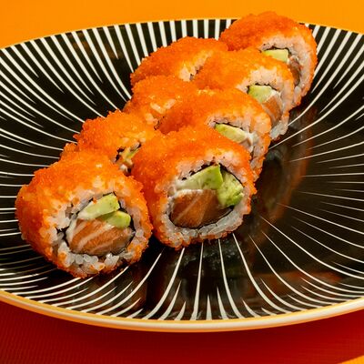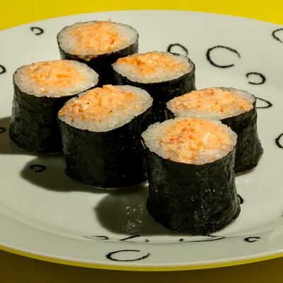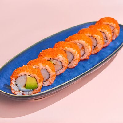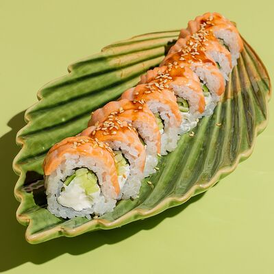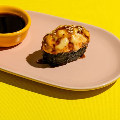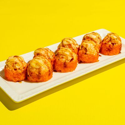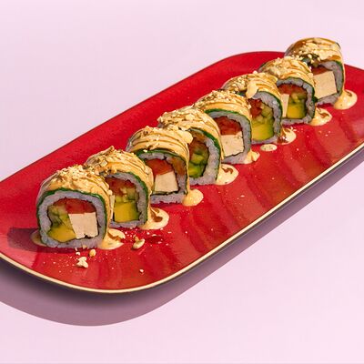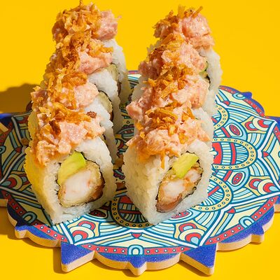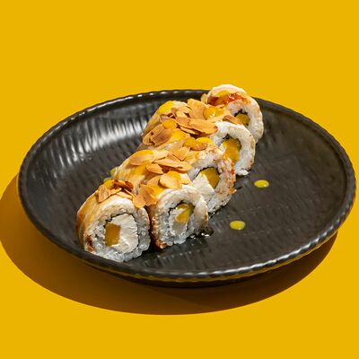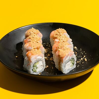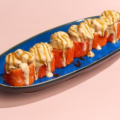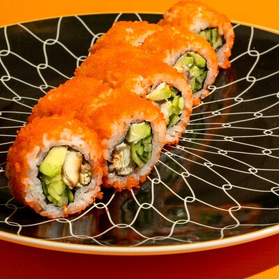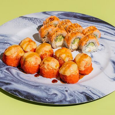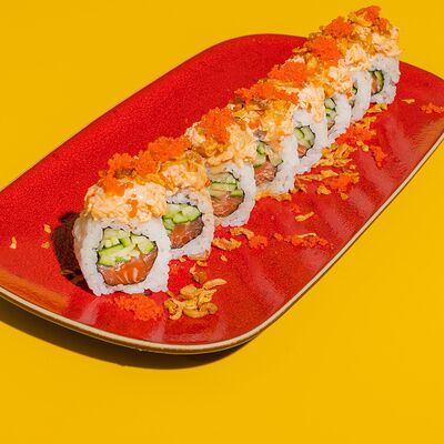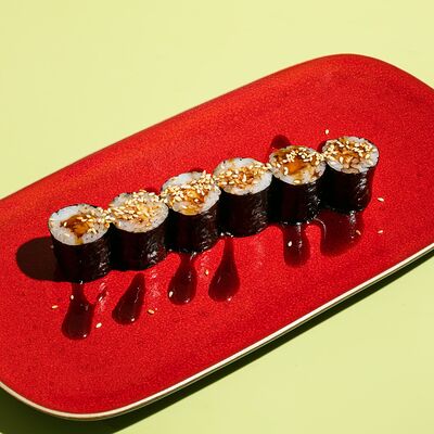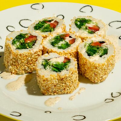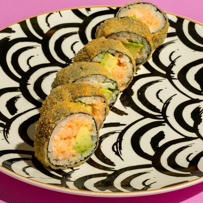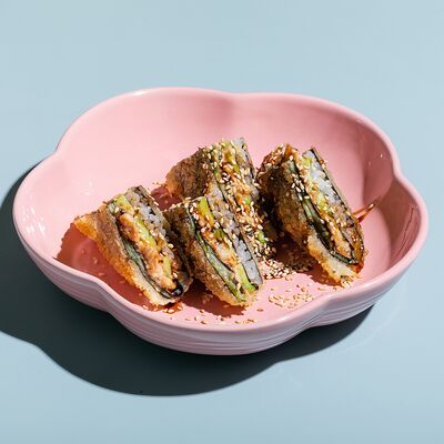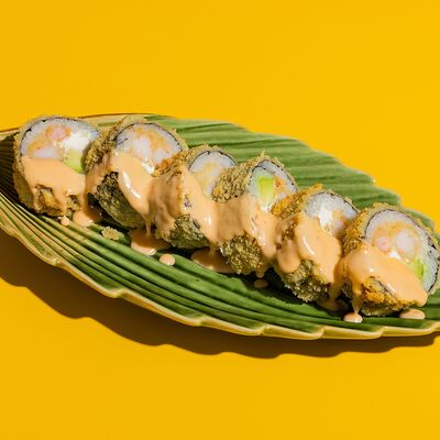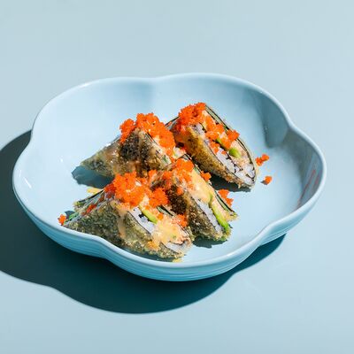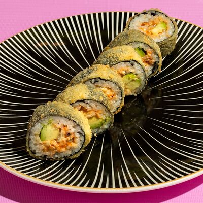 Рис, нори, острый копченый угорь, авокадо, кляр, соус унаги-чили, кунжут