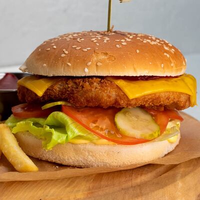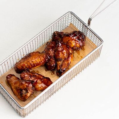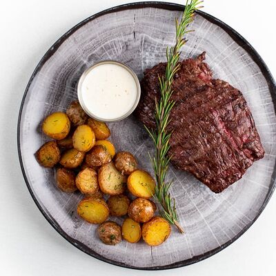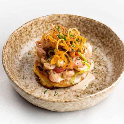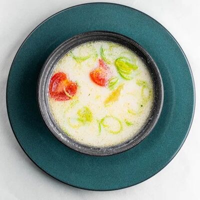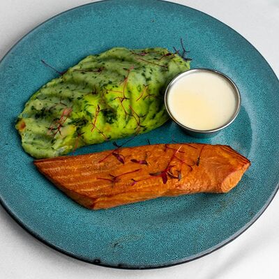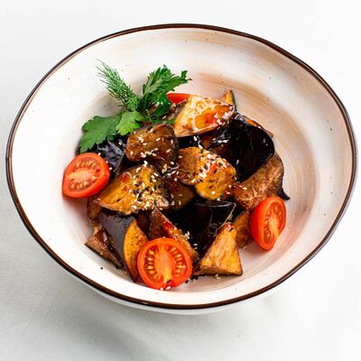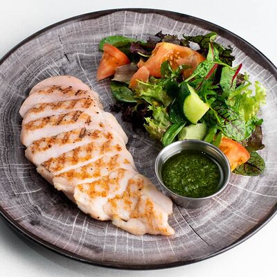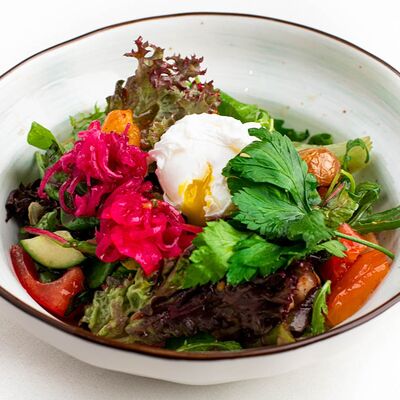 Микс-салат, огурец, помидор, молодой печеный картофель, куриная грудка, тайский острый соус чили, маринованный красный лук, свежая кинза и яйцо пашот