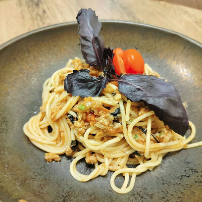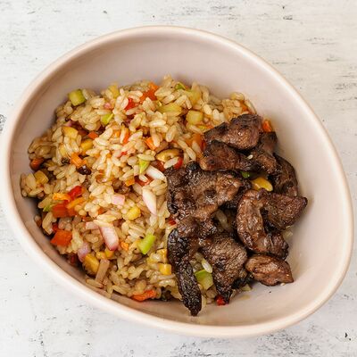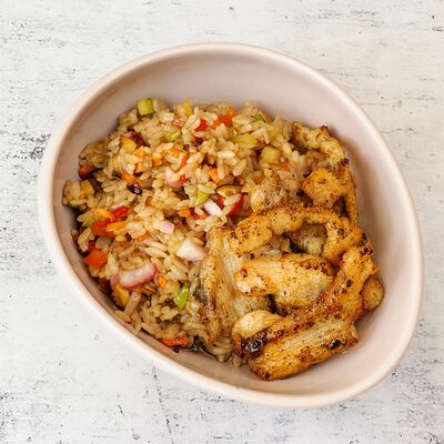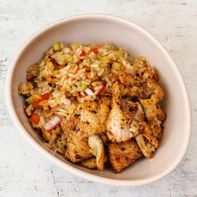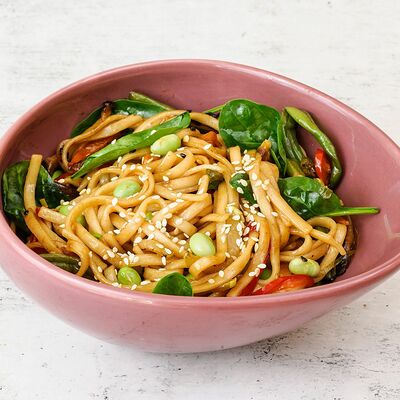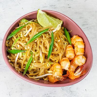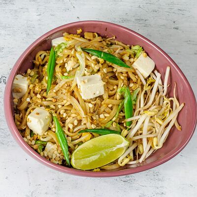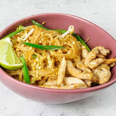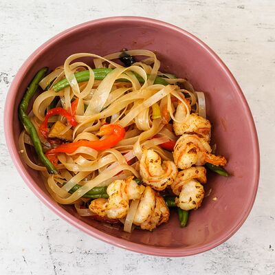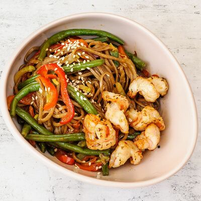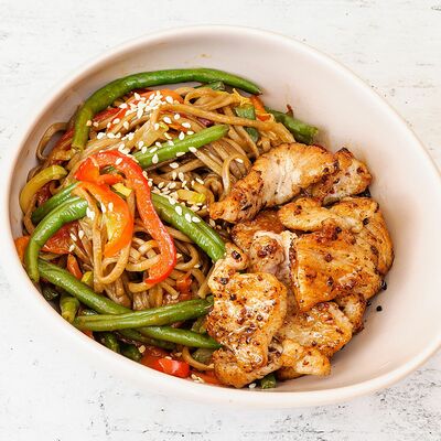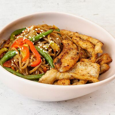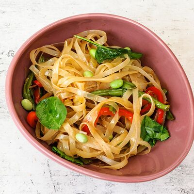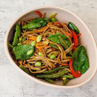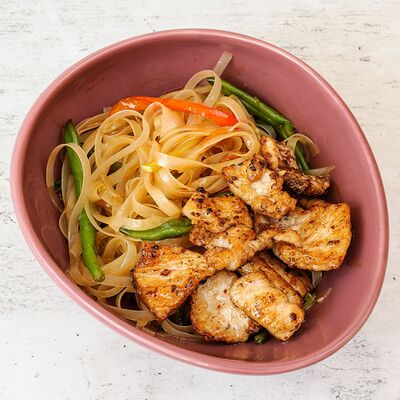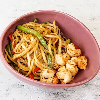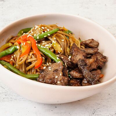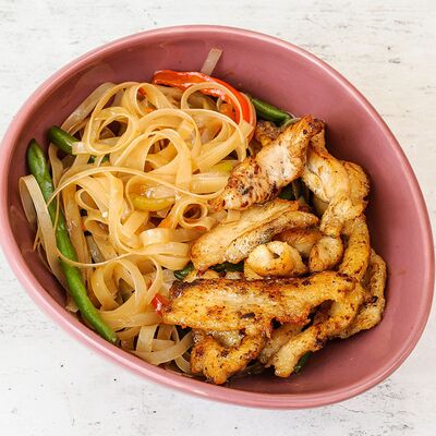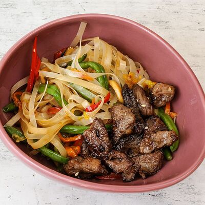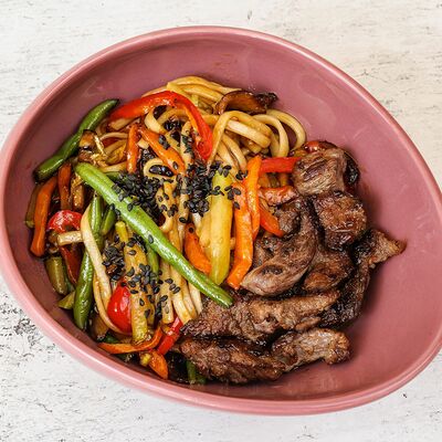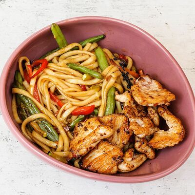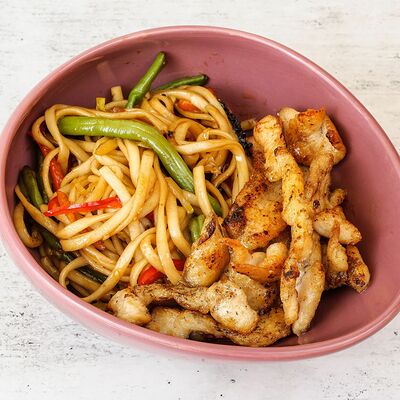 Яичная лапша, филе куриное, морковь, цукини, ялтинский лук, перец болгарский, фасоль стручковая, грибы шиитаке, соус терияки, соус вок