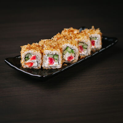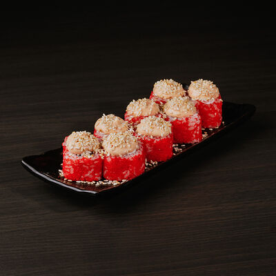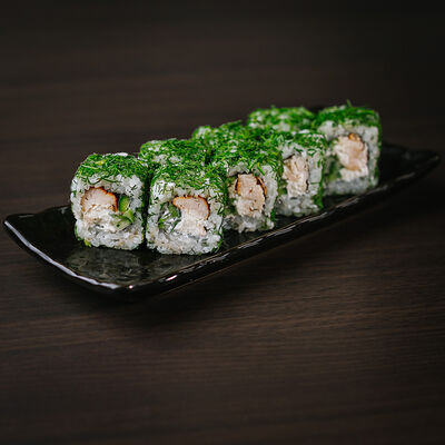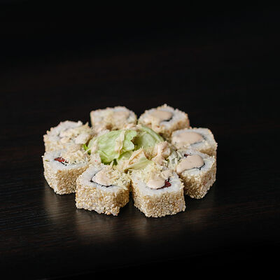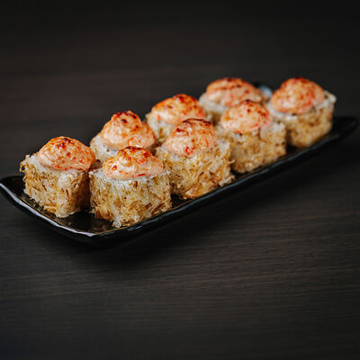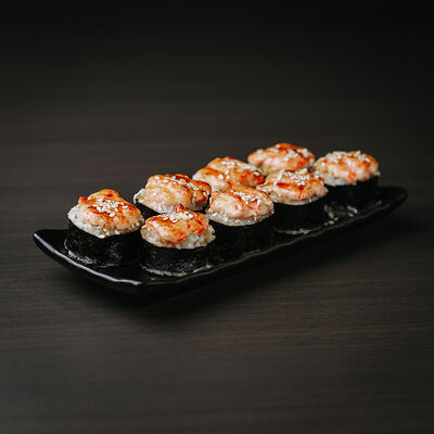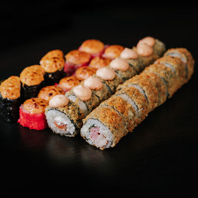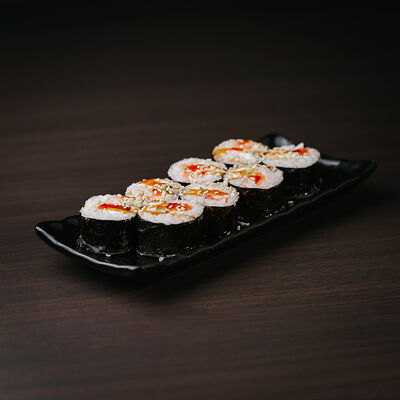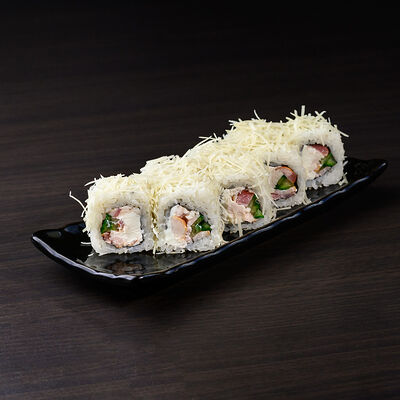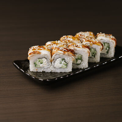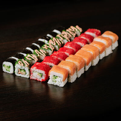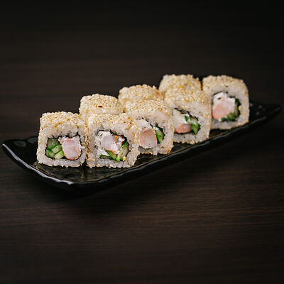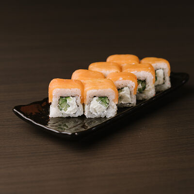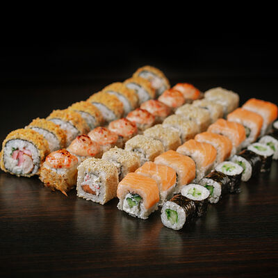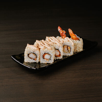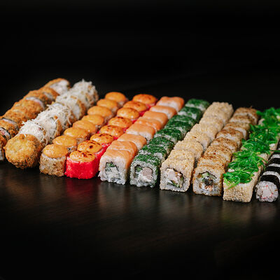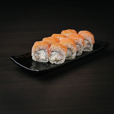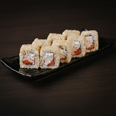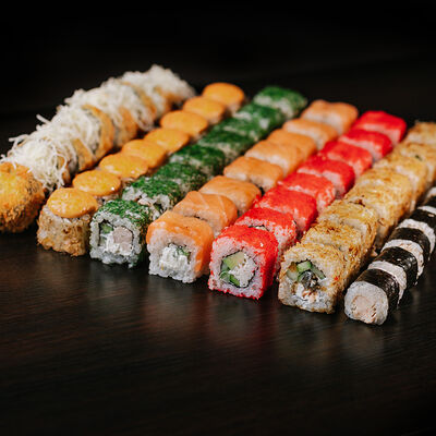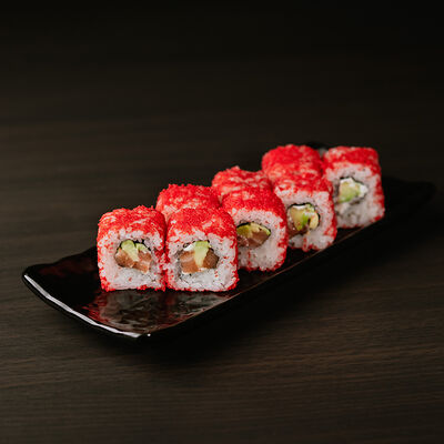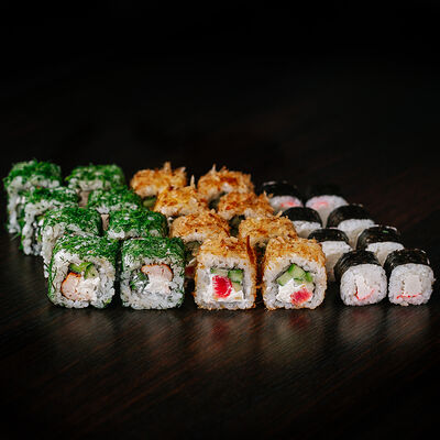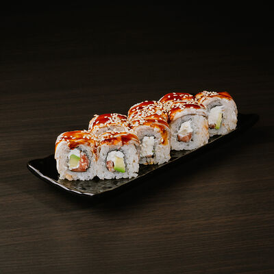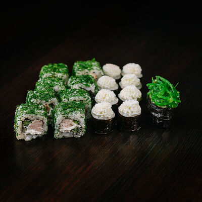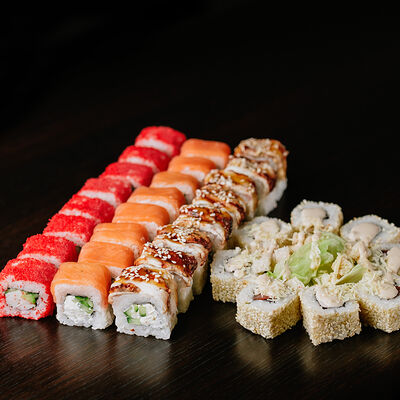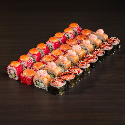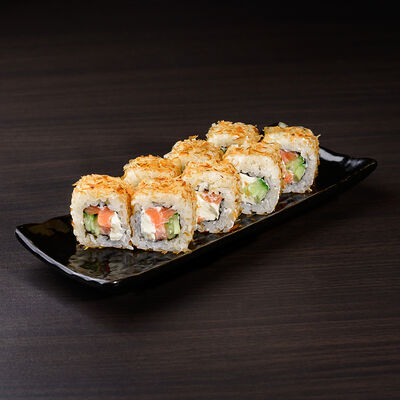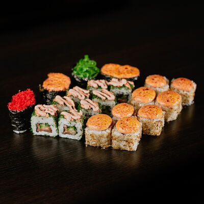 Рис, нори, сливочный сыр, лосось, кальмар, краб, авокадо, кунжут, унаги соус. В комплекте: соевый соус, имбирь, васаби