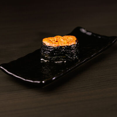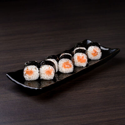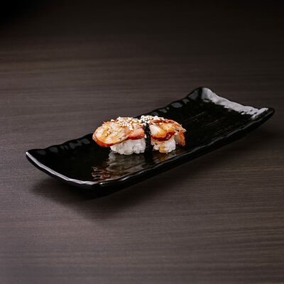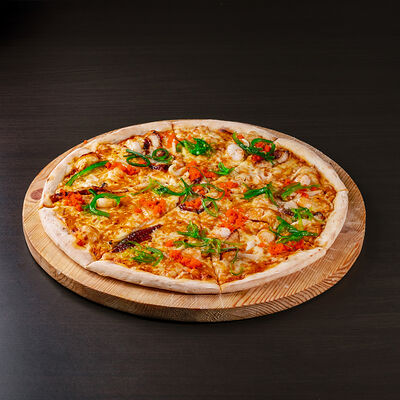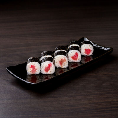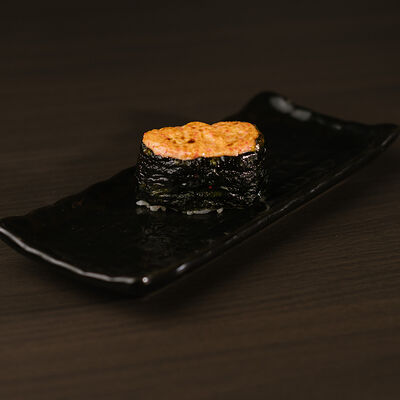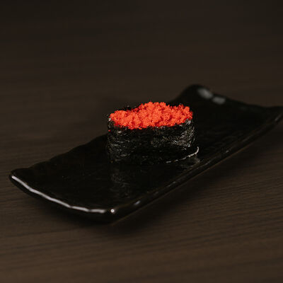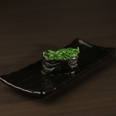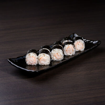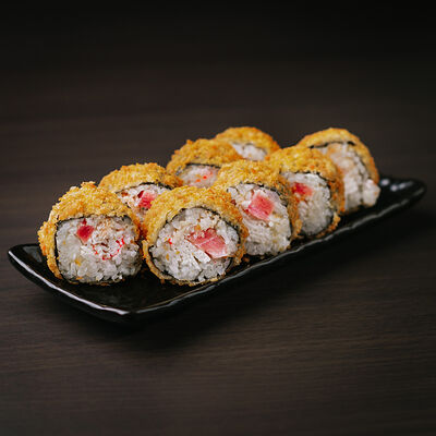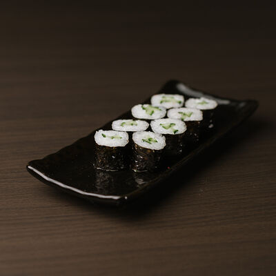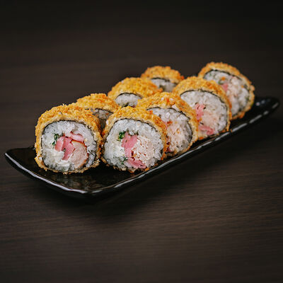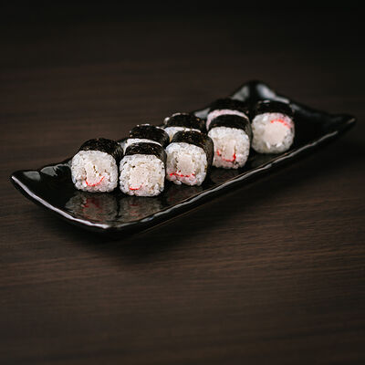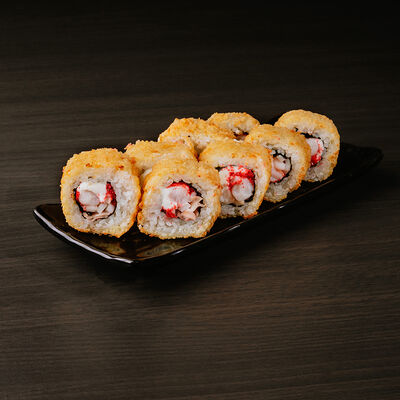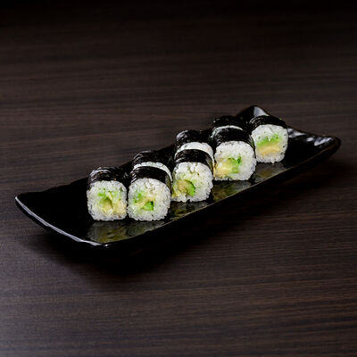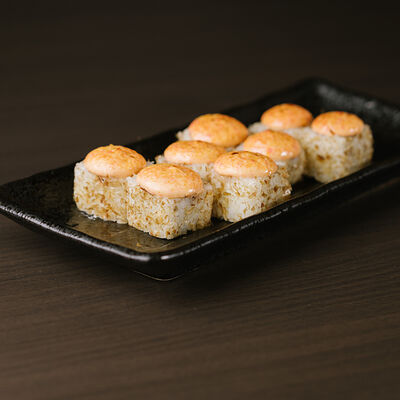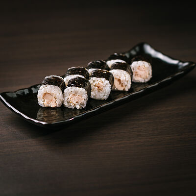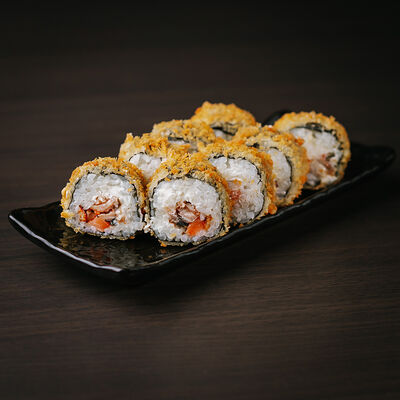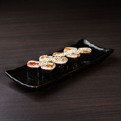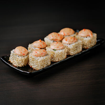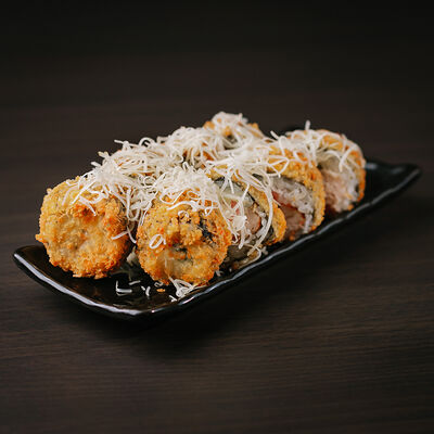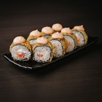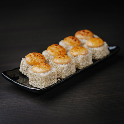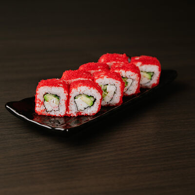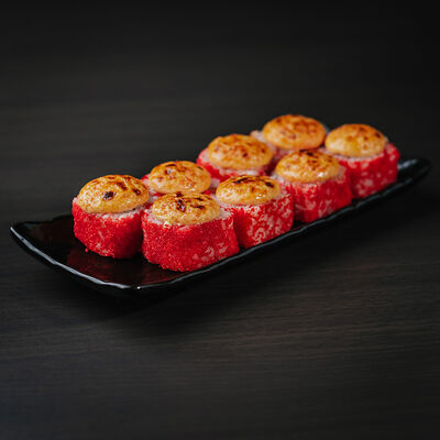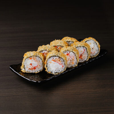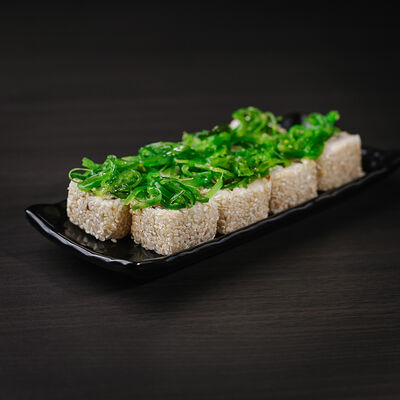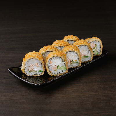 Рис, нори, сливочный сыр, лосось, кальмар, краб, авокадо, кунжут, унаги соус. В комплекте: соевый соус, имбирь, васаби