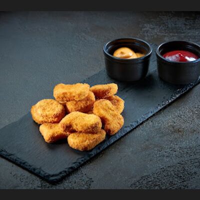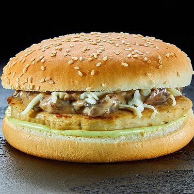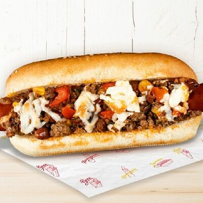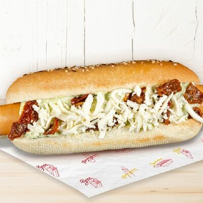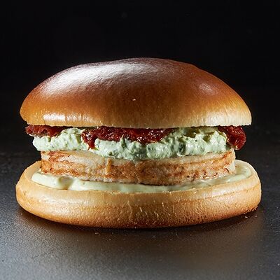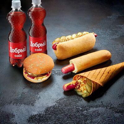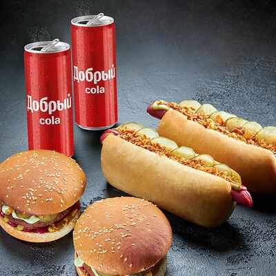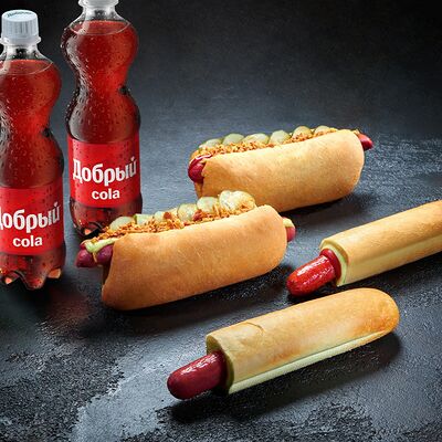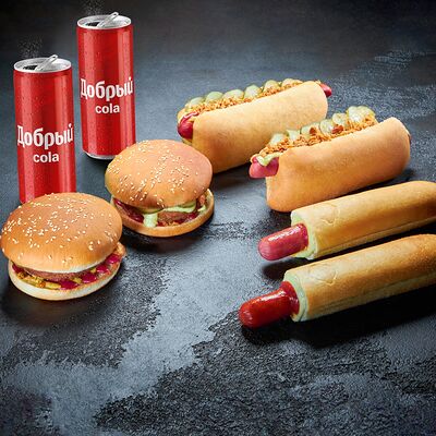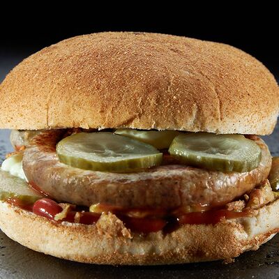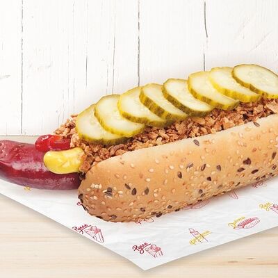 Датская булочка, фрикадельки растительные, кетчуп, лук, салат из огурцов