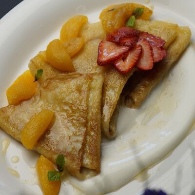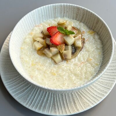 Рисовая крупа, молоко, сливки, сливочное масло, сахарный песок, апельсины, кумкват, свежая клубника, миндаль, листья мяты
