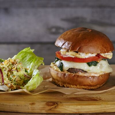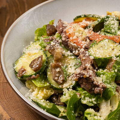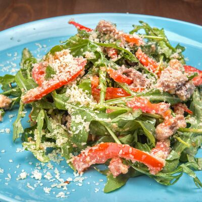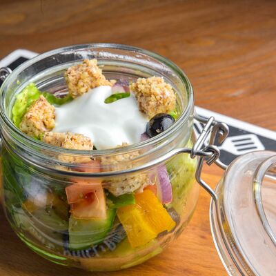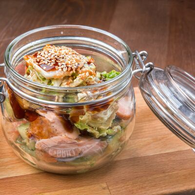 Копченый лосось, авокадо, свежие овощи и ореховая заправка