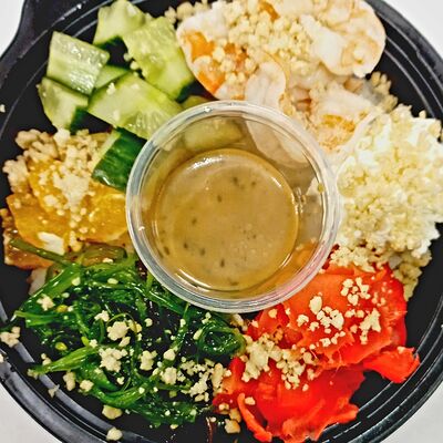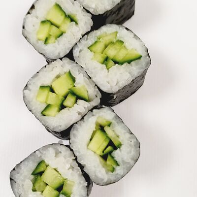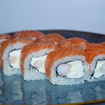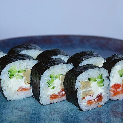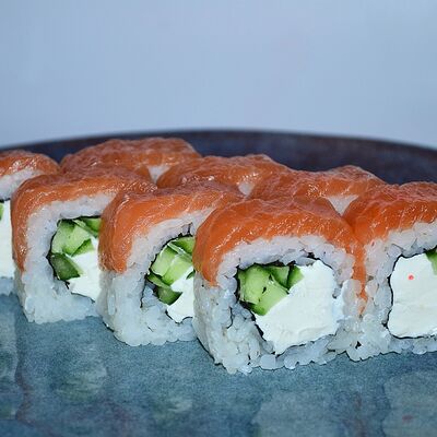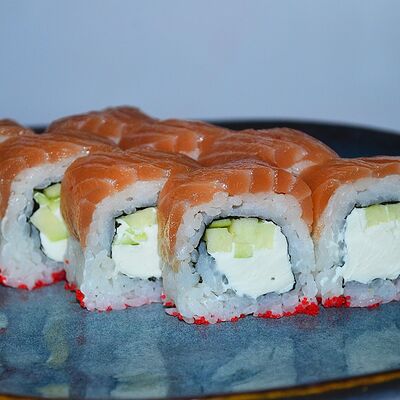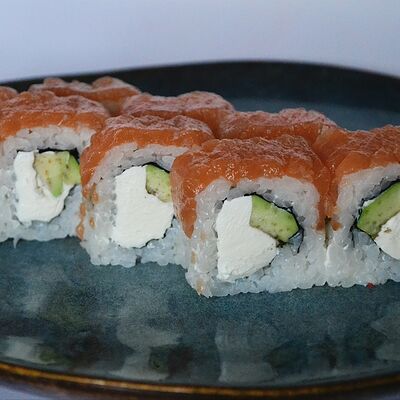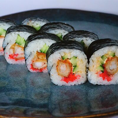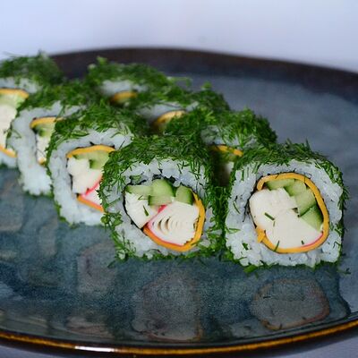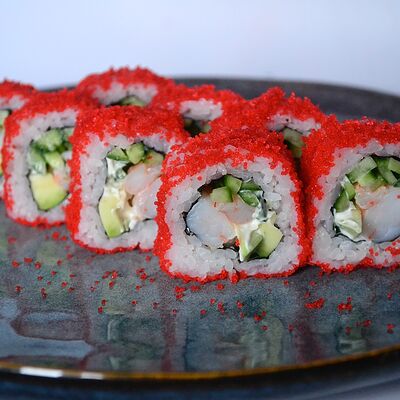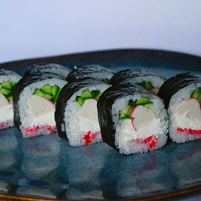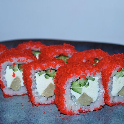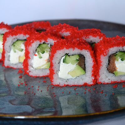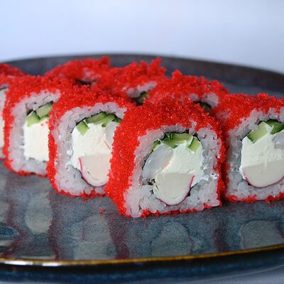 Краб (имитация), огурец, сыр сливочный, тобико, рис, нори (8 шт.)