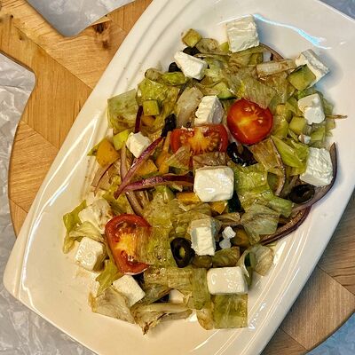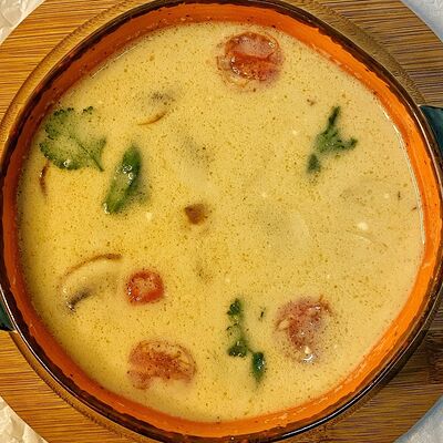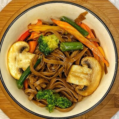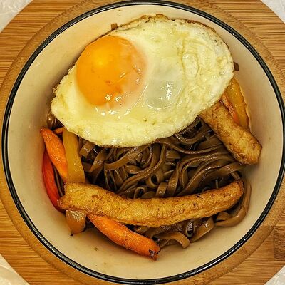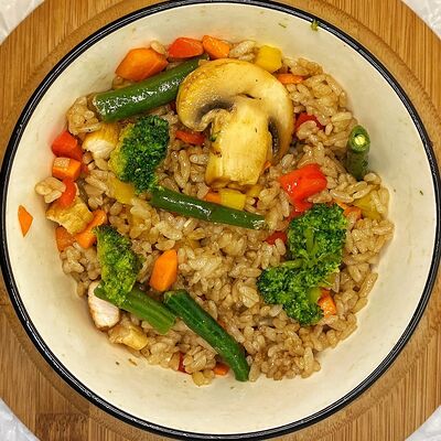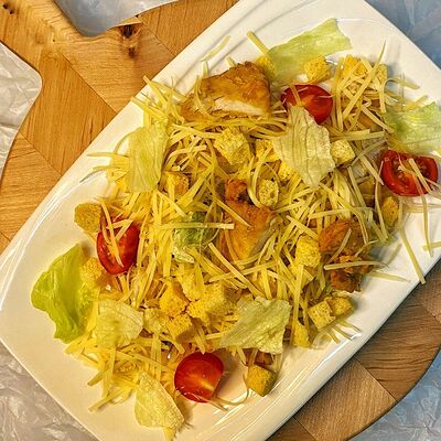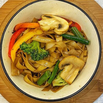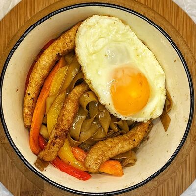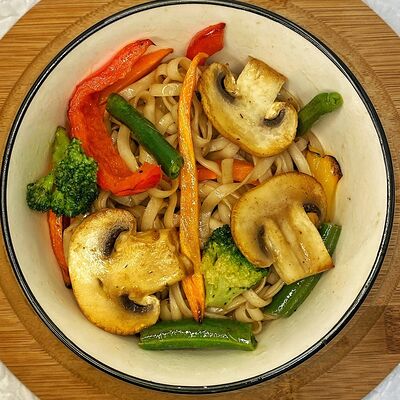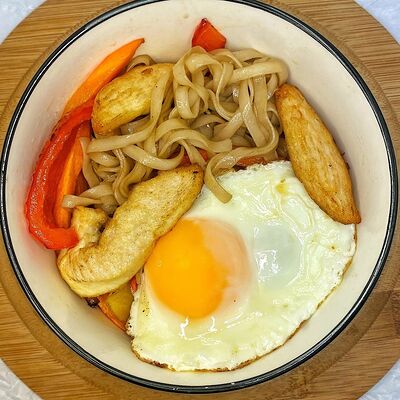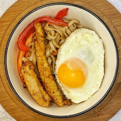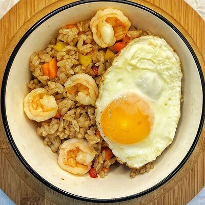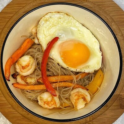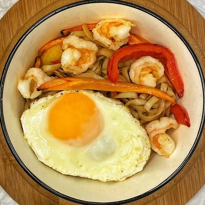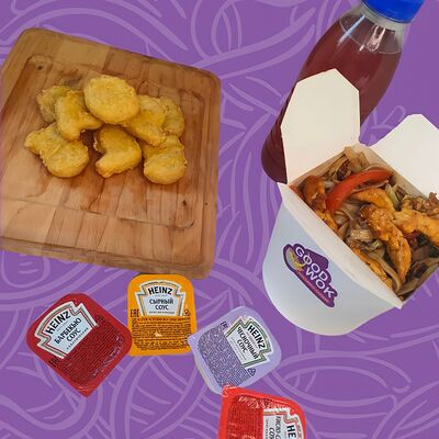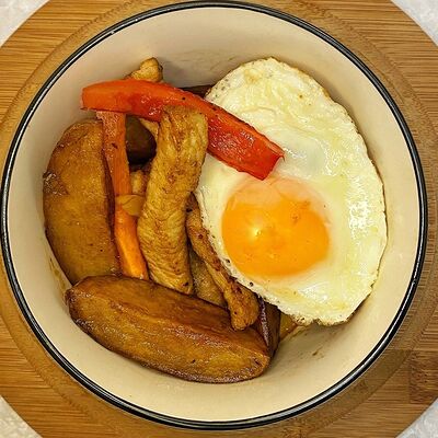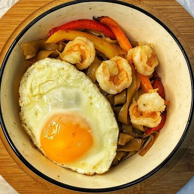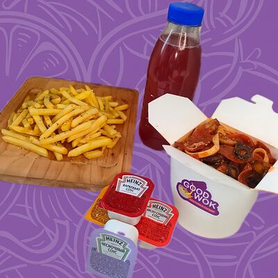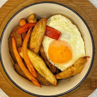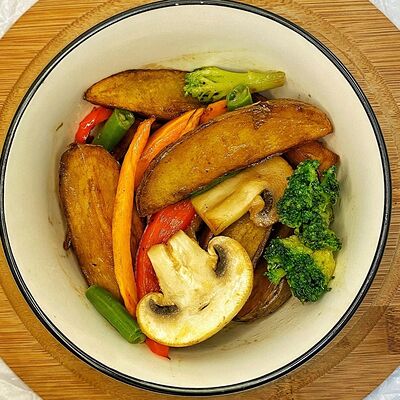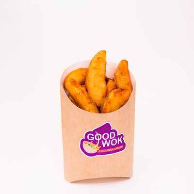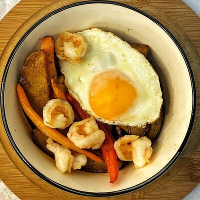 Картофель по-деревенски, стручковая фасоль, перец болгарский, морковь, тигровые креветки, яйцо, соус на выбор
