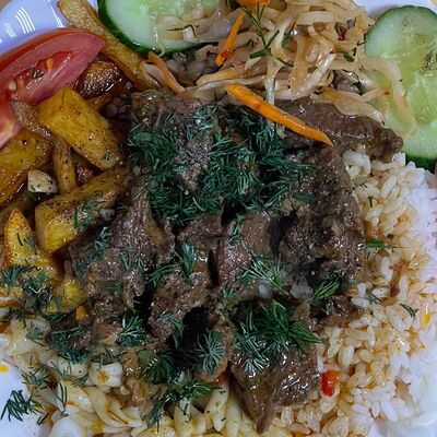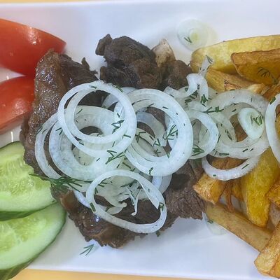 Бифштекс. Картошка фри гречка рис макароны жареные яйца помидоры огурцы