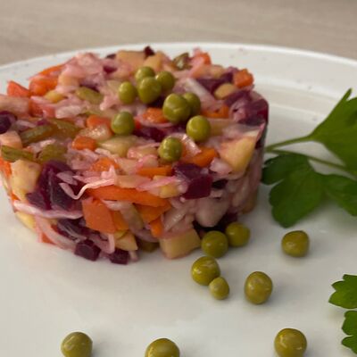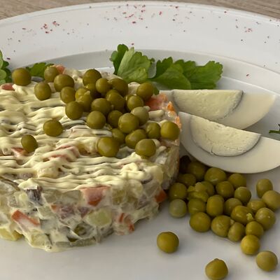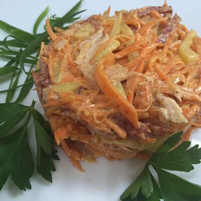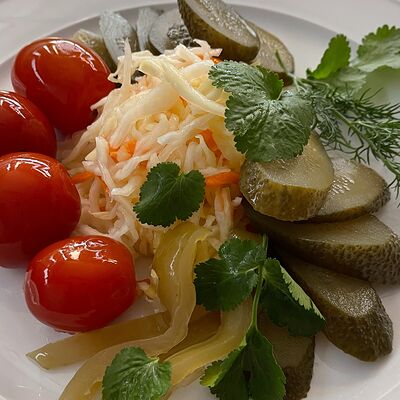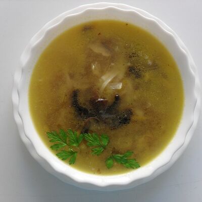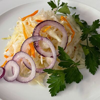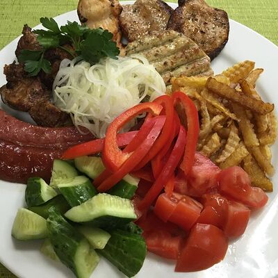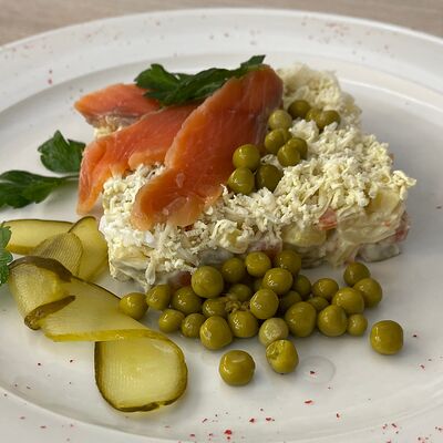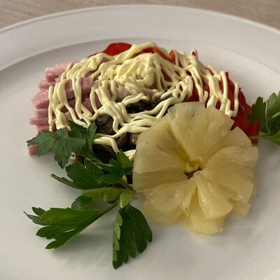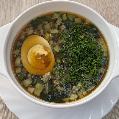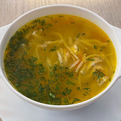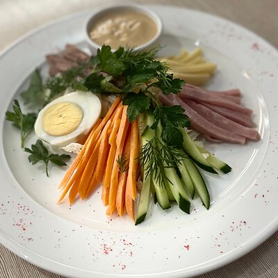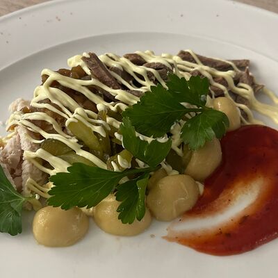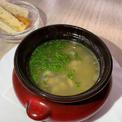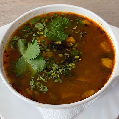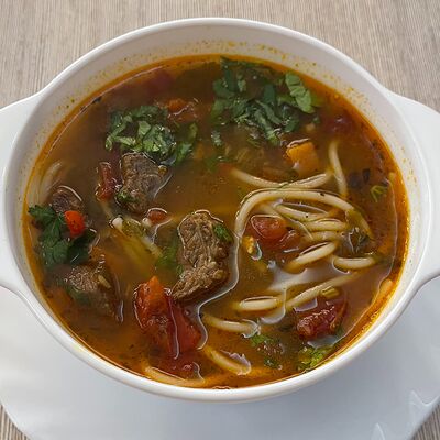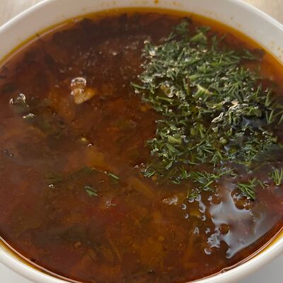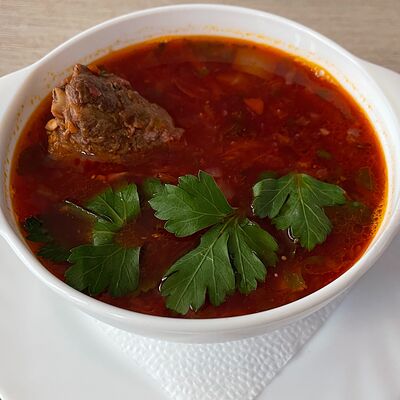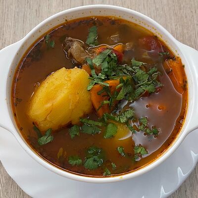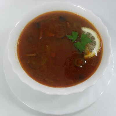 Мы предлагаем вам мясную солянку, собранную из свежей телятины, копченой курицы, двух видов колбасы, соленого огурца, маслин, моркови и лука