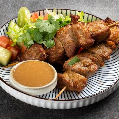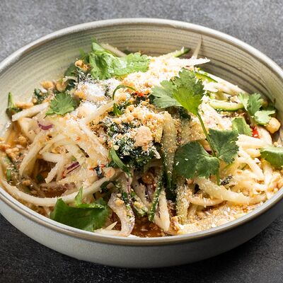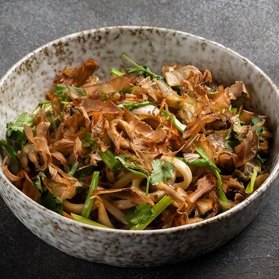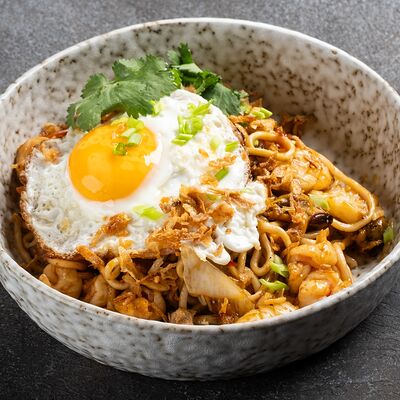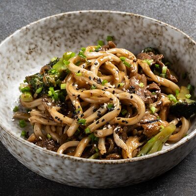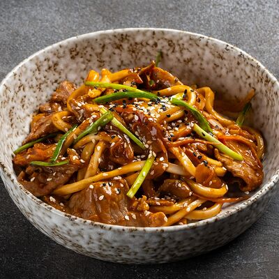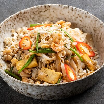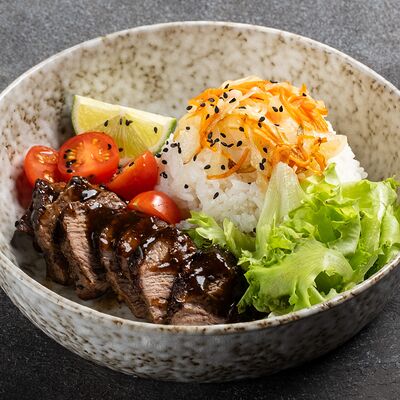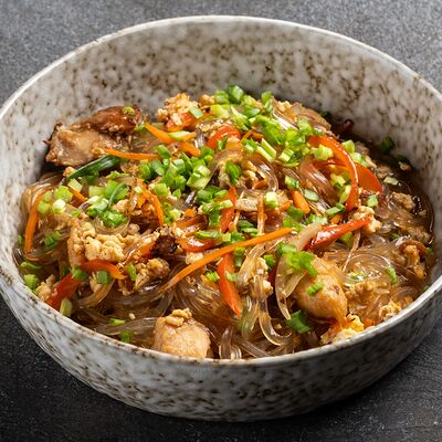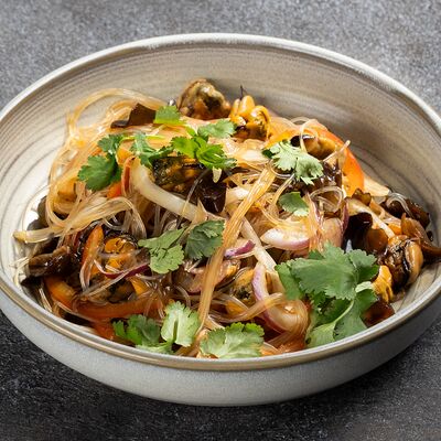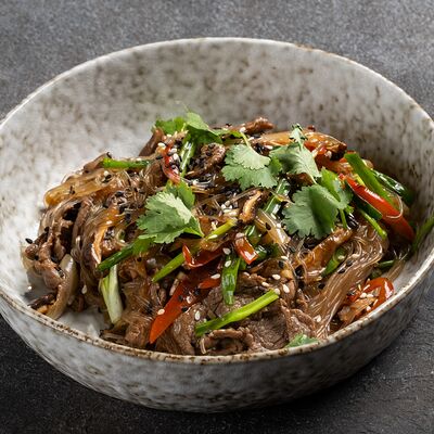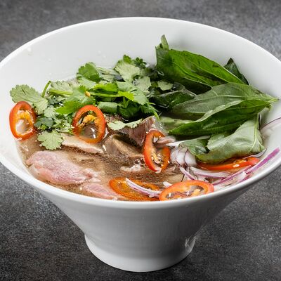 Говядина, лапша рисовая, ростки сои, кинза, базилик, лук, лайм, соус