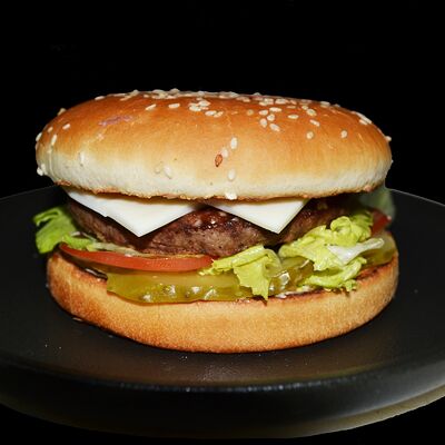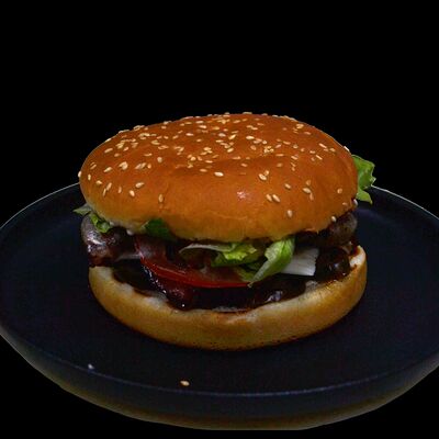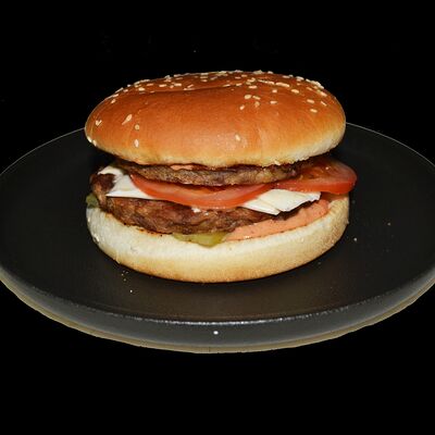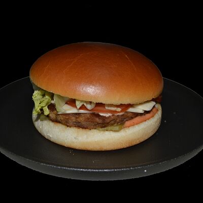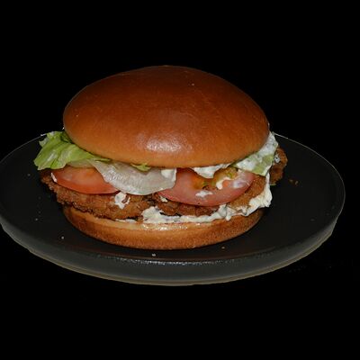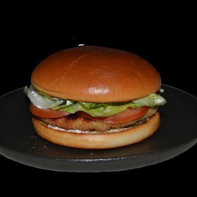 Стейк из филе грудки, румяная булочка Бриошь, спелый томат, свежий салат, фирменный соус Тар-Тар от шеф повара