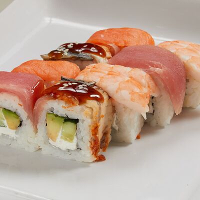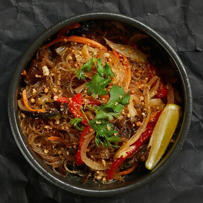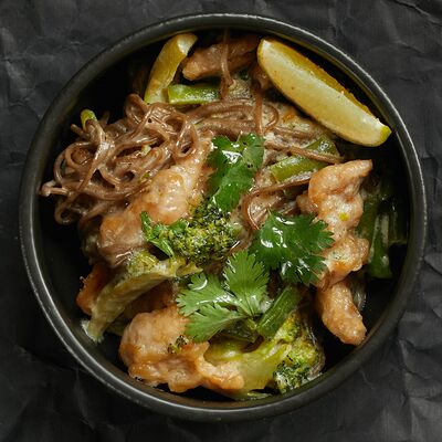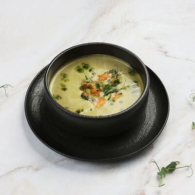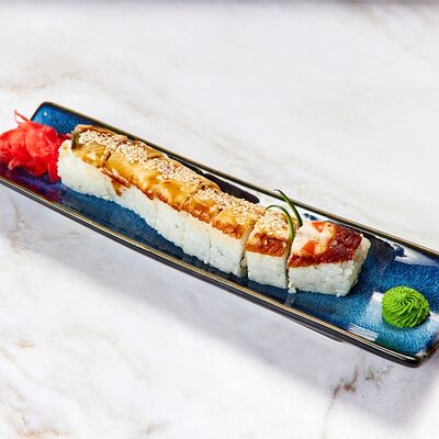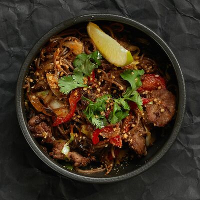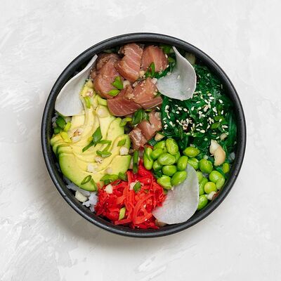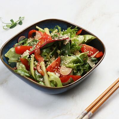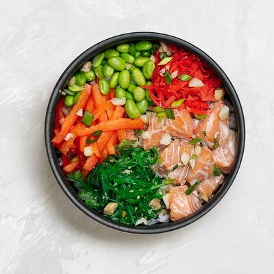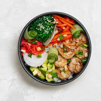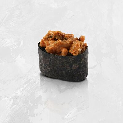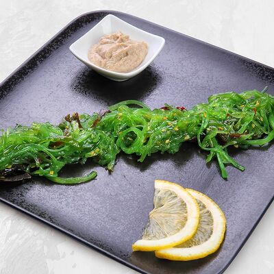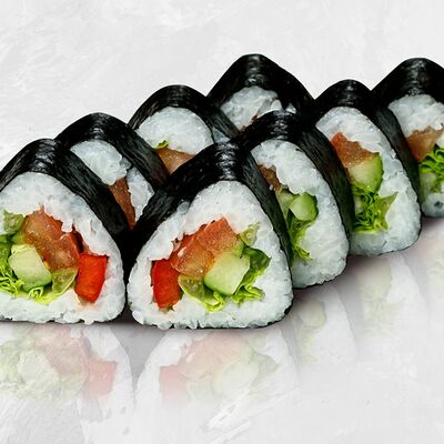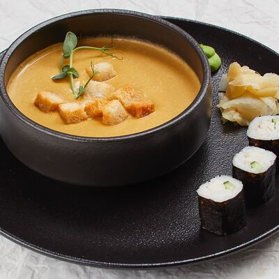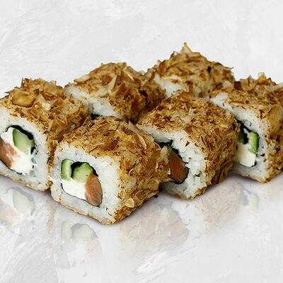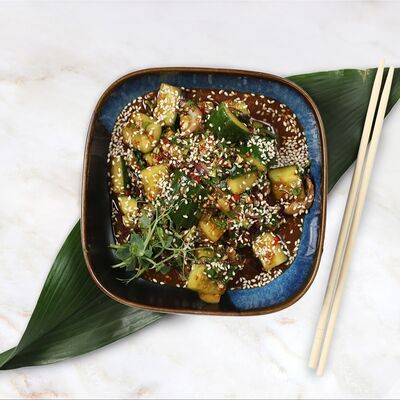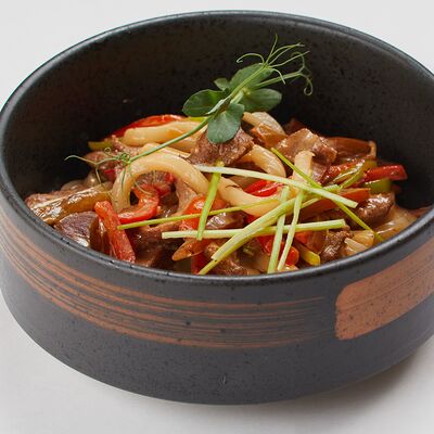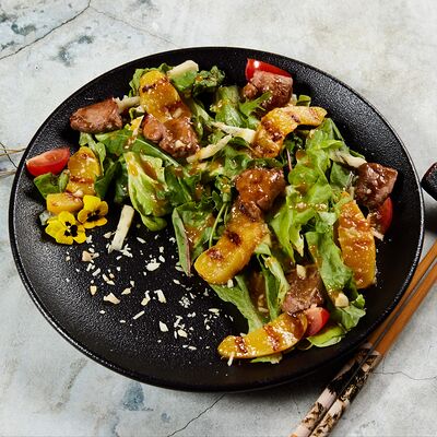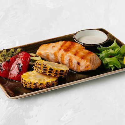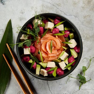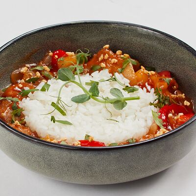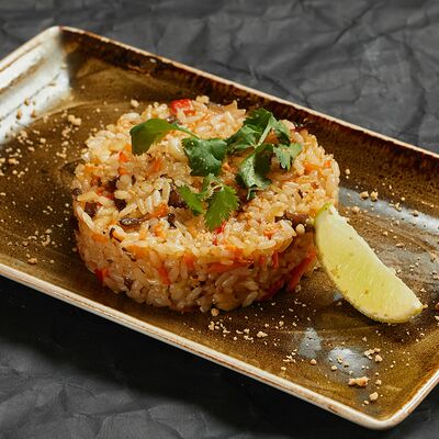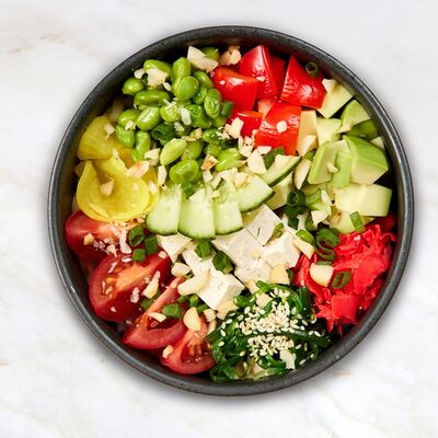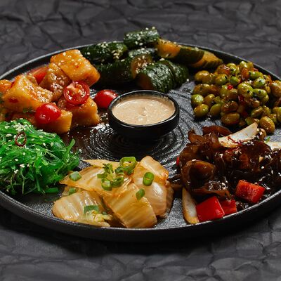 С сыром тофу, зеленой фасолью, авокадо и необычным свекольным соусом. На подушке из отварного булгура