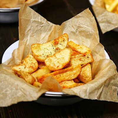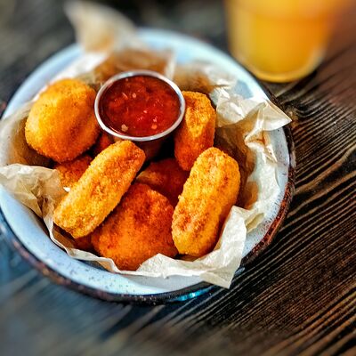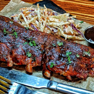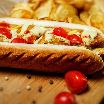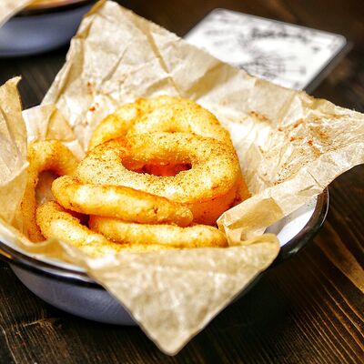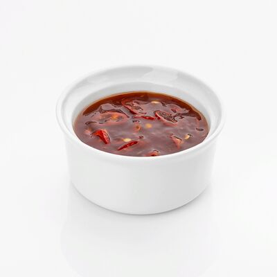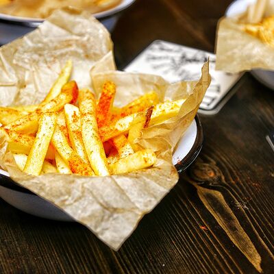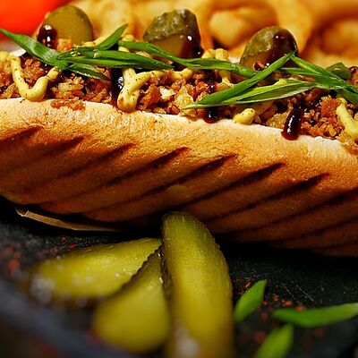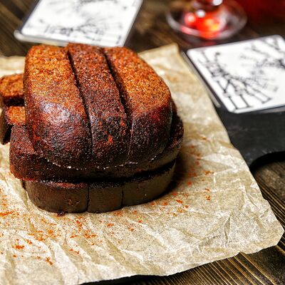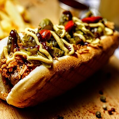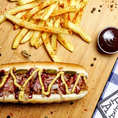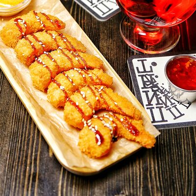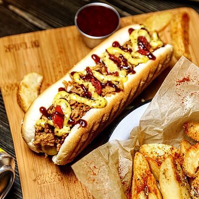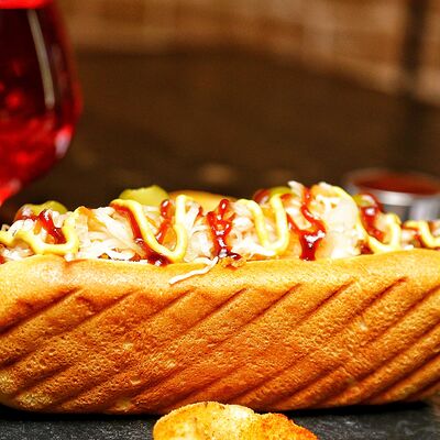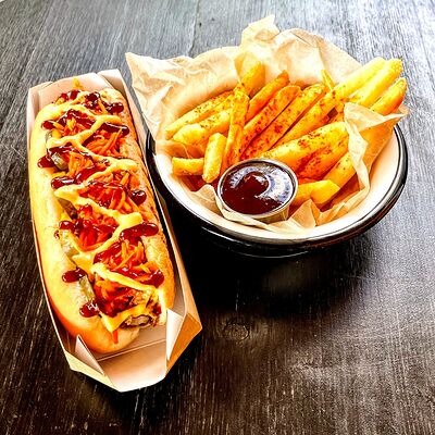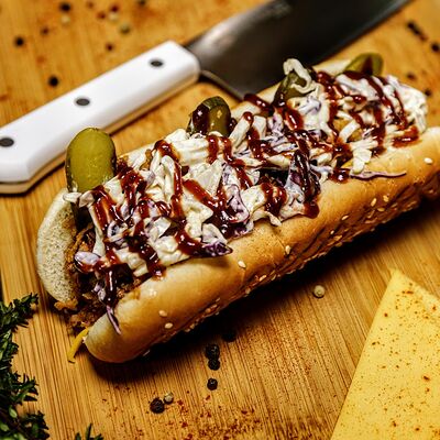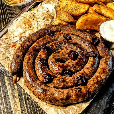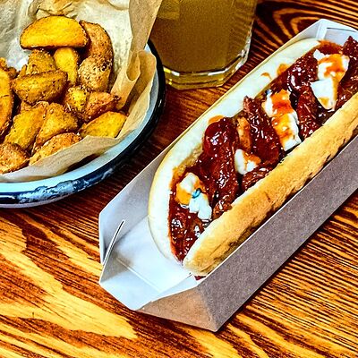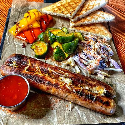 Пряные свиные колбаски с хрустящими тостами, битыми огурцами, перцем гриль, салат коул (красная и белая капуста, морковь, фирменная заправка) и соусом сладкий чили, наша вариация испанских колбасок