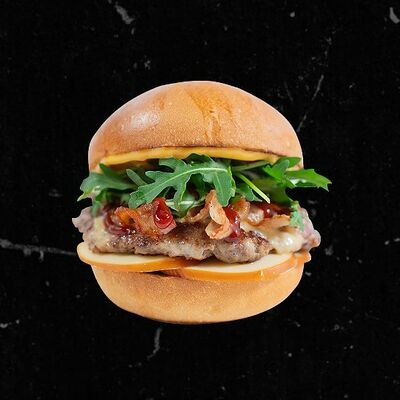 Булочка, луковый конфитюр, котлеты (мраморная говядина), (2 шт.), ломтики сыра (2 шт.), рукола, соус блю чиз