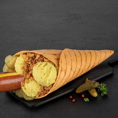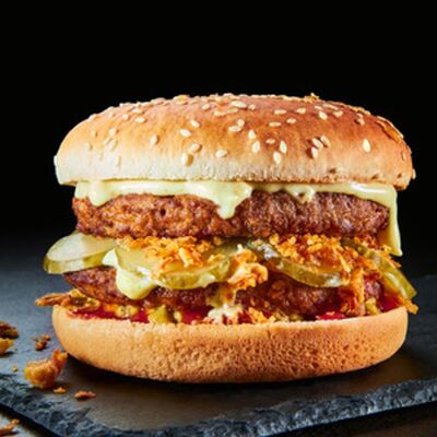 Чиабатта, котлеты из говядины (2 шт.), обжаренные на гриле, с комбинированными специями, фирменные маринованные огурчики и соус