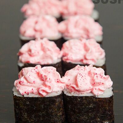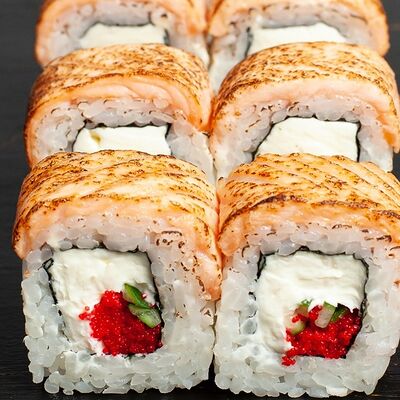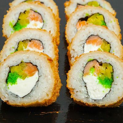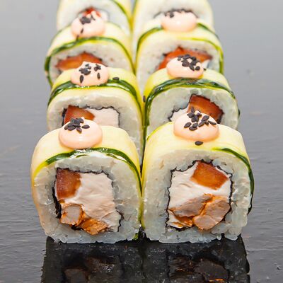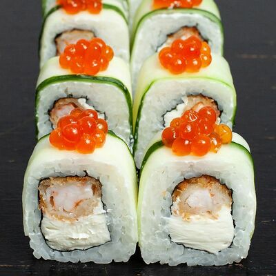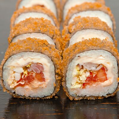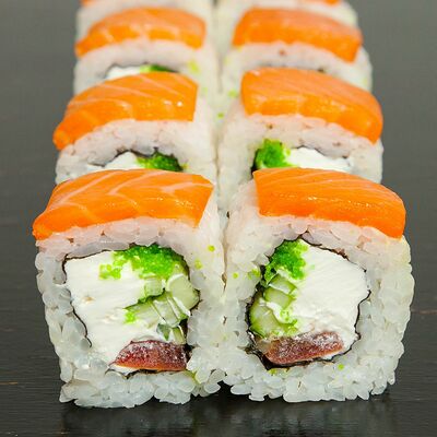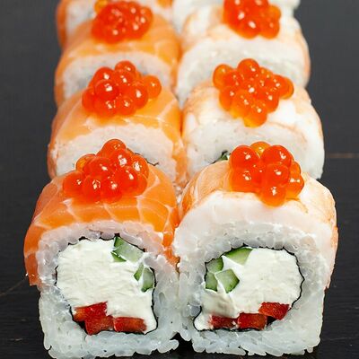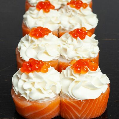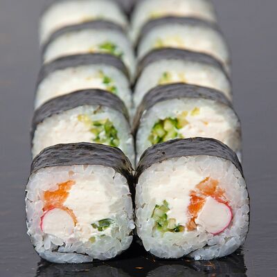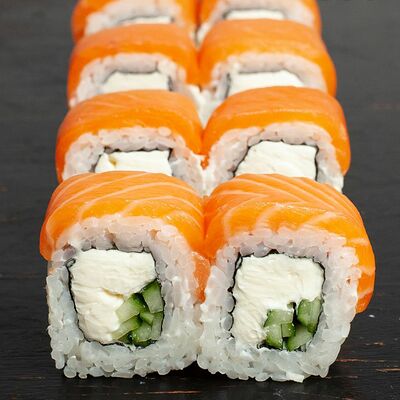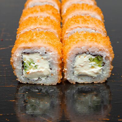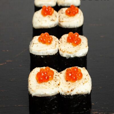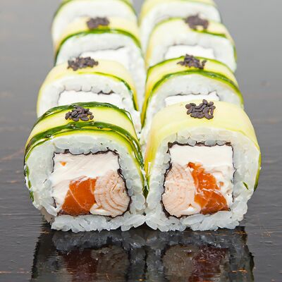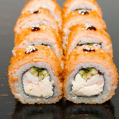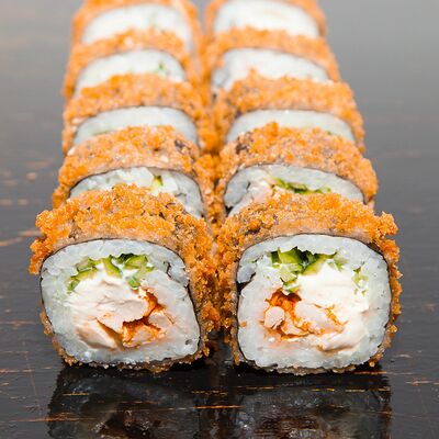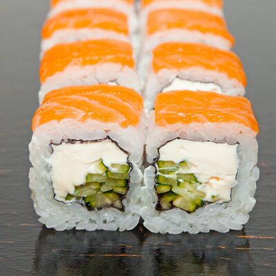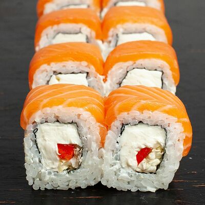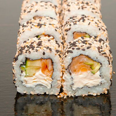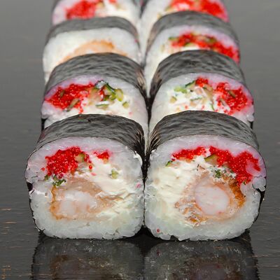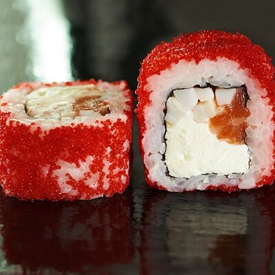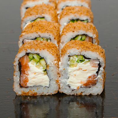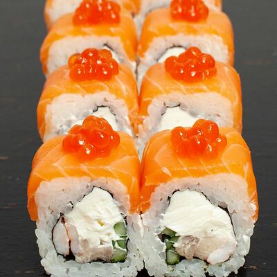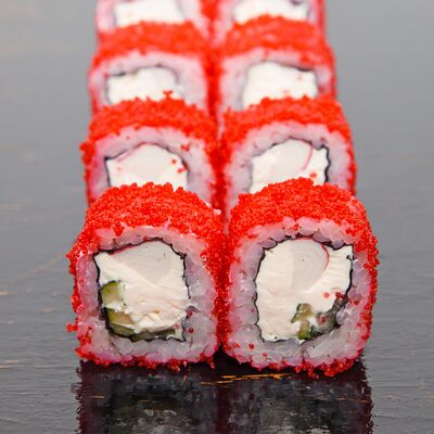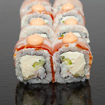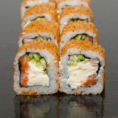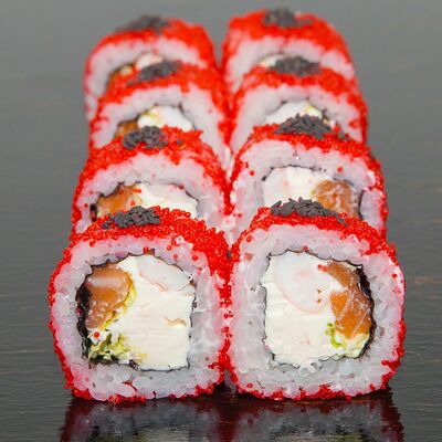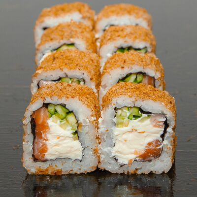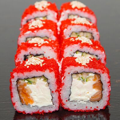 Сыр сливочный, лосось холодного копчения, спайси-соус, огурец, масаго красная, рис, нори (8 шт.)