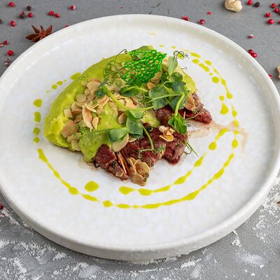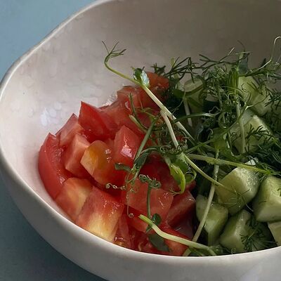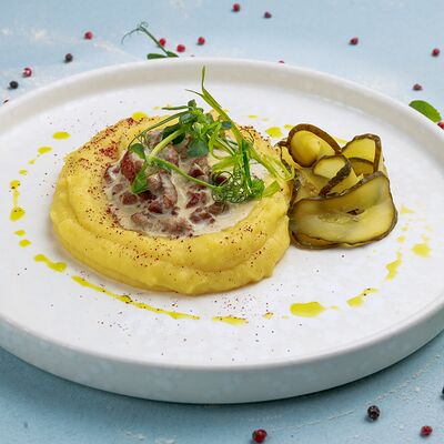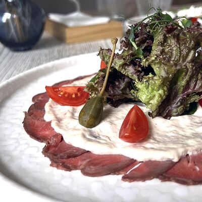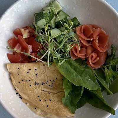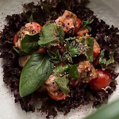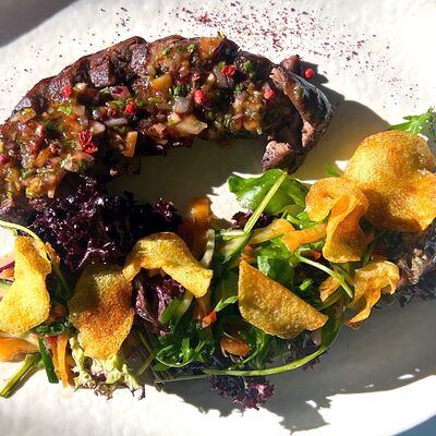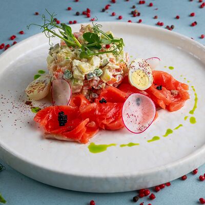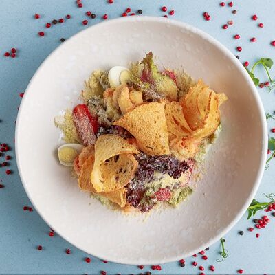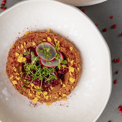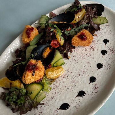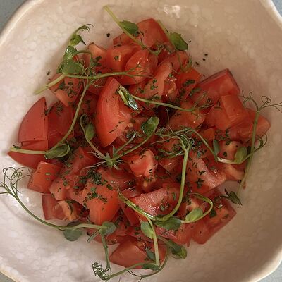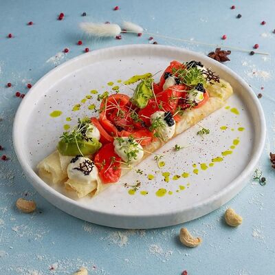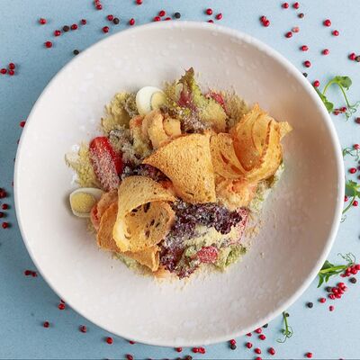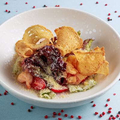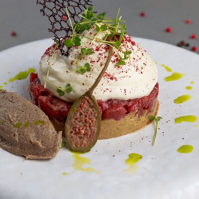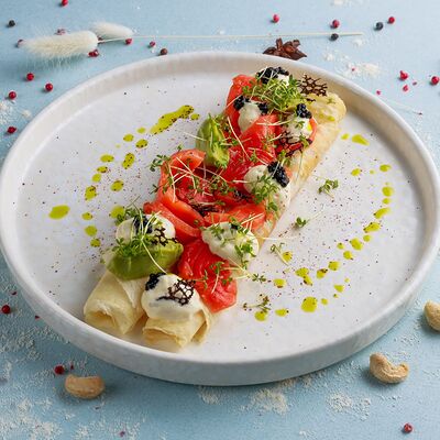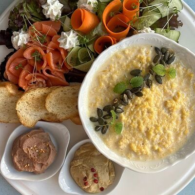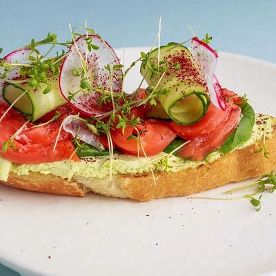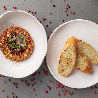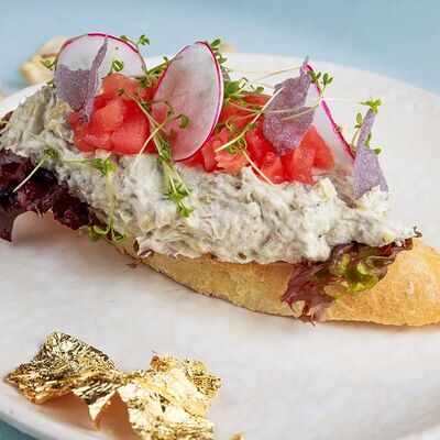 Брускетта с рийетом из копченой макрели. Подается на морковной бриоши с листьями салата лолло росса и тартаром из томатов