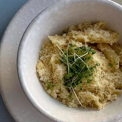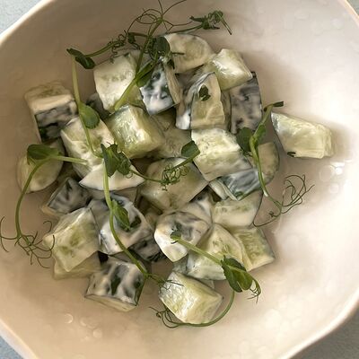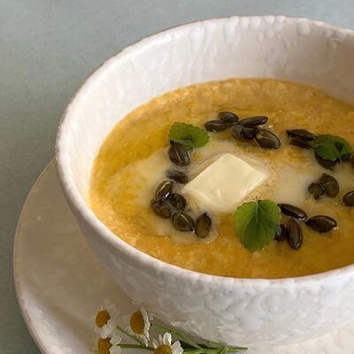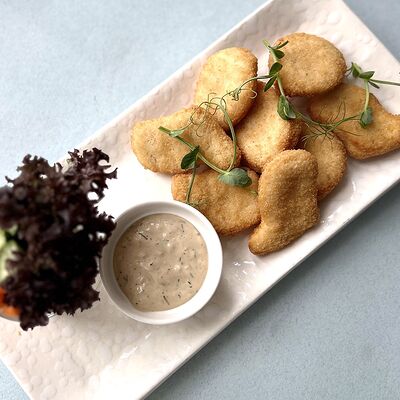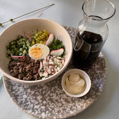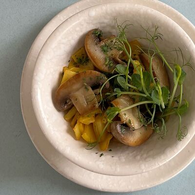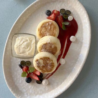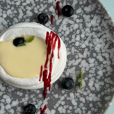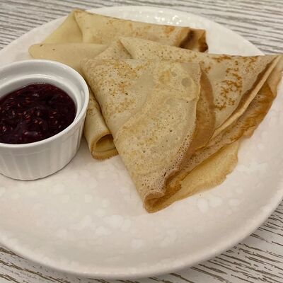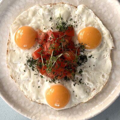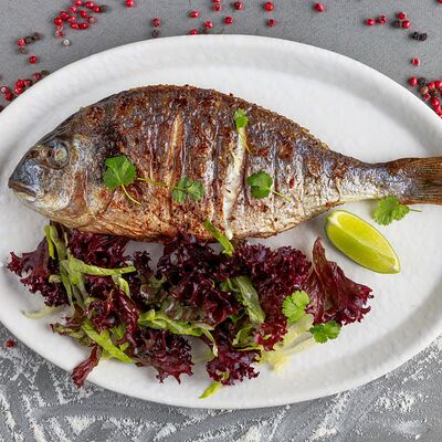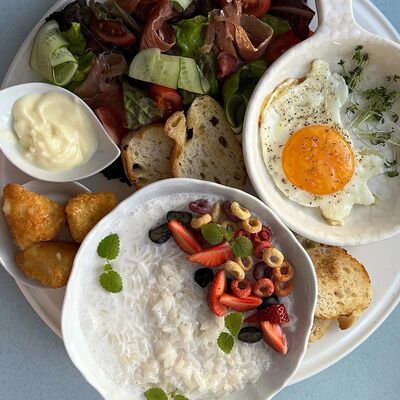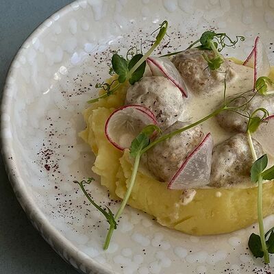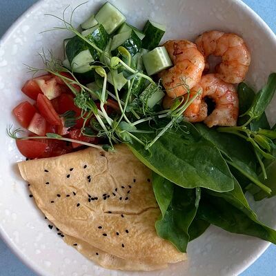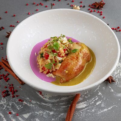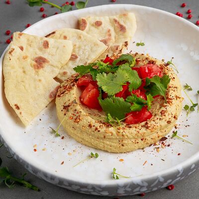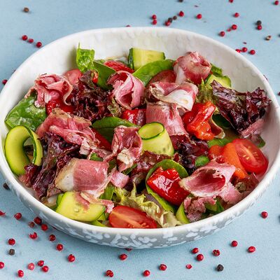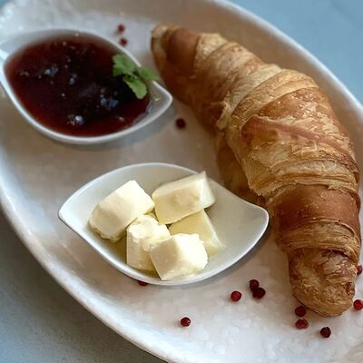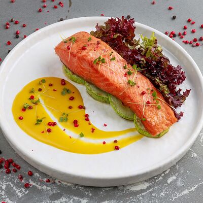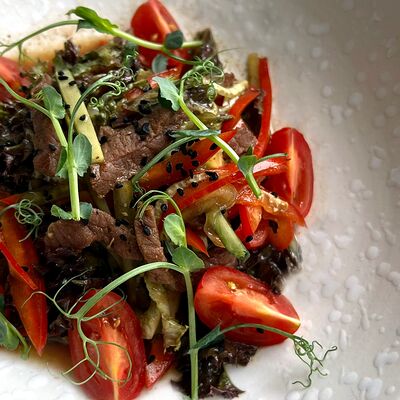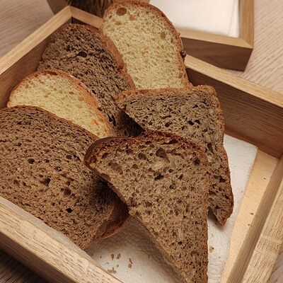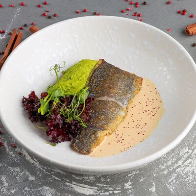 Брускетта с рийетом из копченой макрели. Подается на морковной бриоши с листьями салата лолло росса и тартаром из томатов