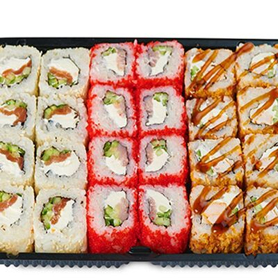 Ролл Филадельфия классический, ролл Филадельфия с огурцом, ролл Филадельфия с авокадо, запеченный ролл Филадельфия (32 шт.), имбирь маринованный, васаби, палочки и соевый соус (160 мл)