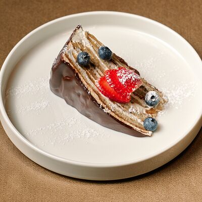 Сливочный крем, банановый корж, банан, шоколадная глазурь, свежие ягоды, сахарная пудра