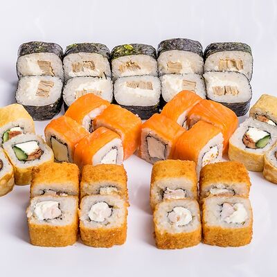 Ролл Филадельфия классик, ролл Тобико, ролл Урра фреш, ролл Унаги классик, ролл Гоа фреш. Соевый соус, имбирь и васаби в комплекте не идут (40 шт.)