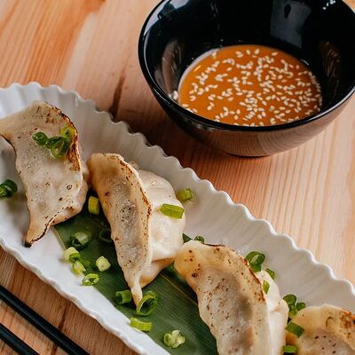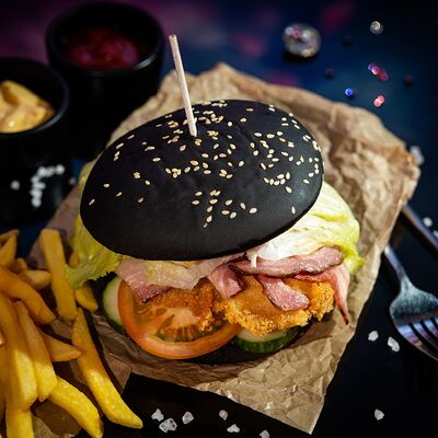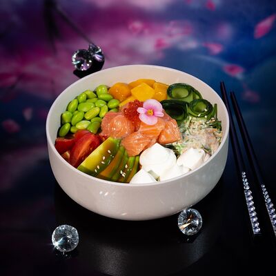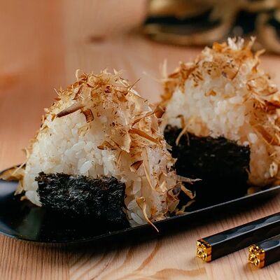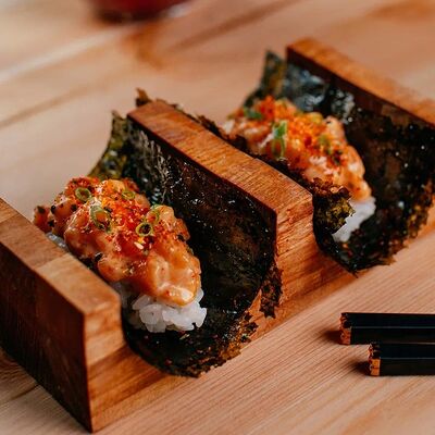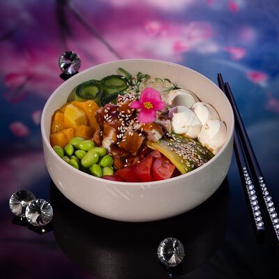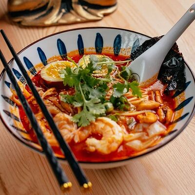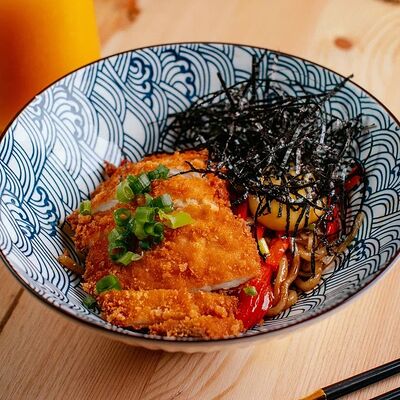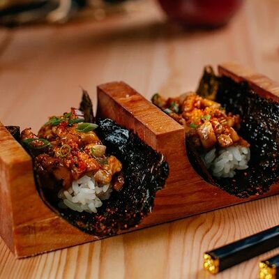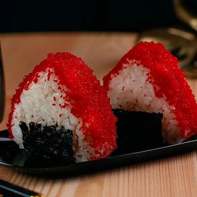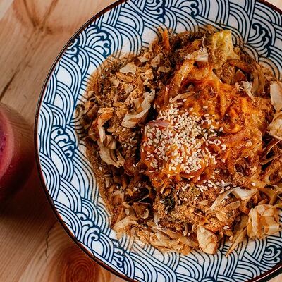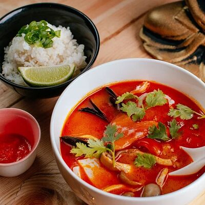 Рис, кальмар, креветки, мидии, морковь, болгарский перец, лук зеленый, устричный соус, жареное яйцо, кунжут, кинза