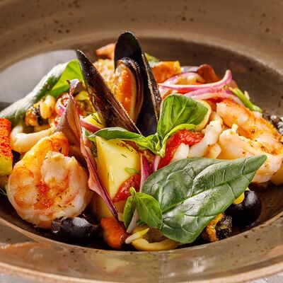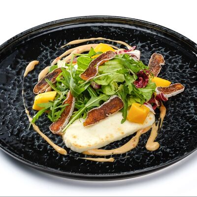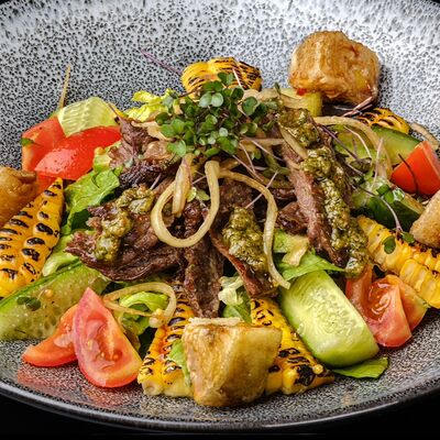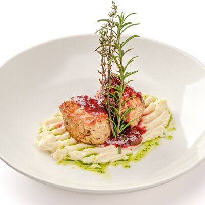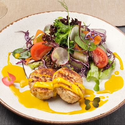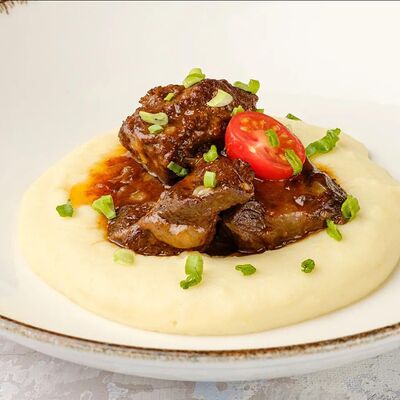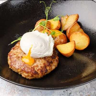 Бифштекс (говядины и свинины, лук, паприка пряная, чёрный перец, соль) с яйцом пашот и обжаренным молодым картофелем