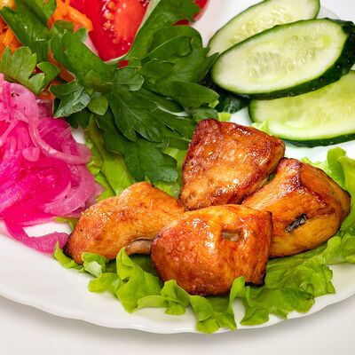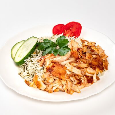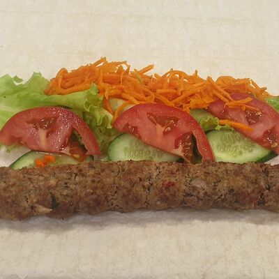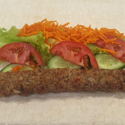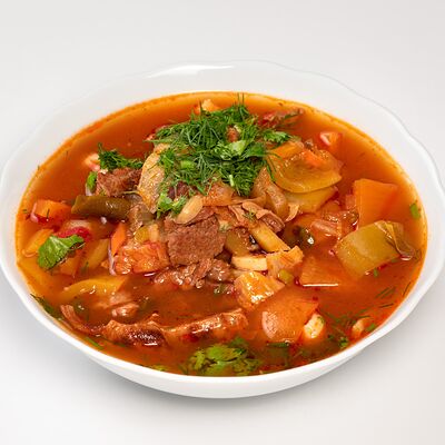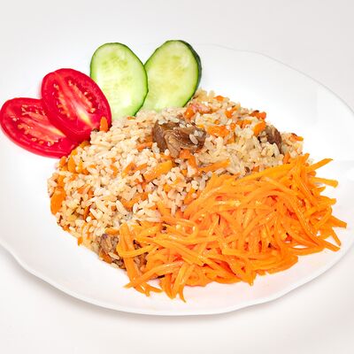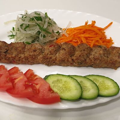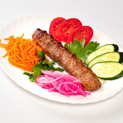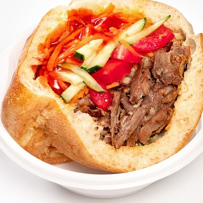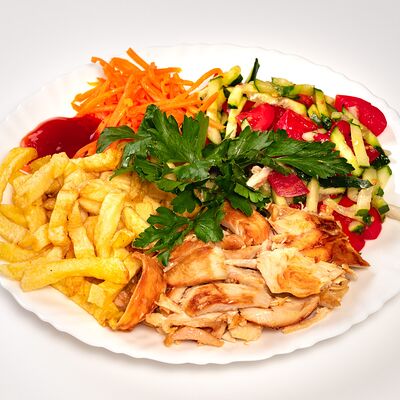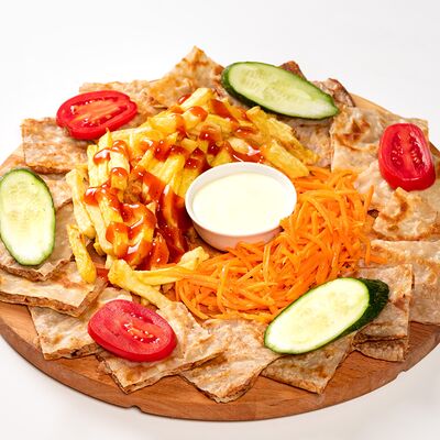 Картофель фри, говядина, огурцы, помидоры, морковь по-корейски, соус, кетчуп, свежий красный лук с зеленью