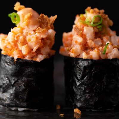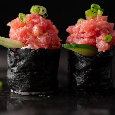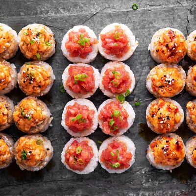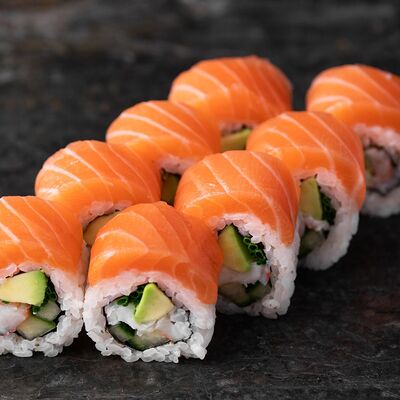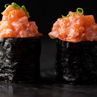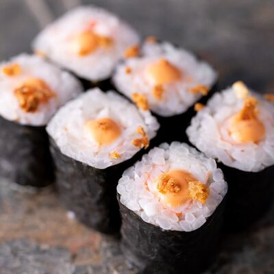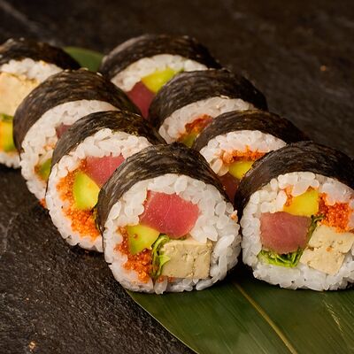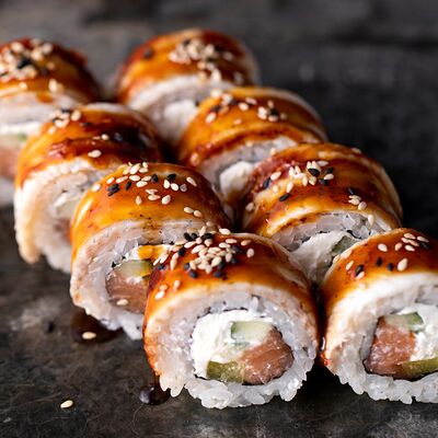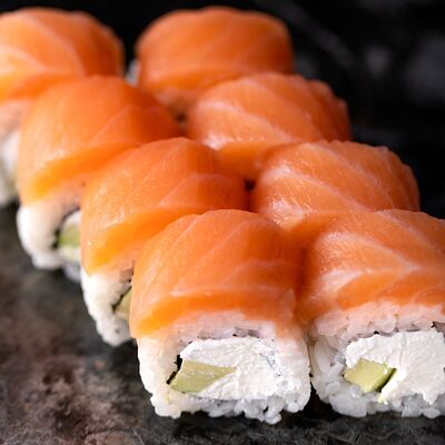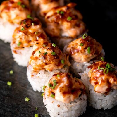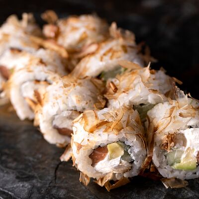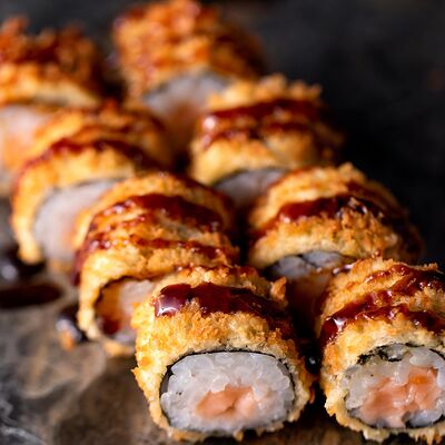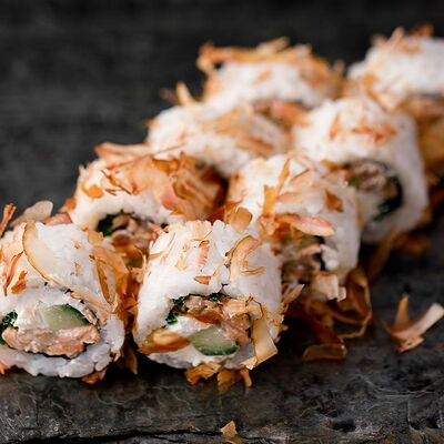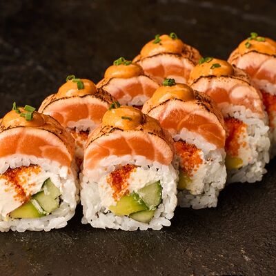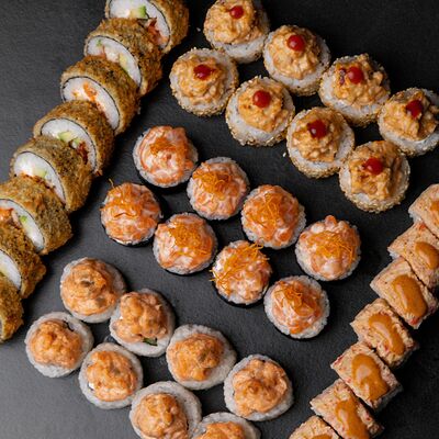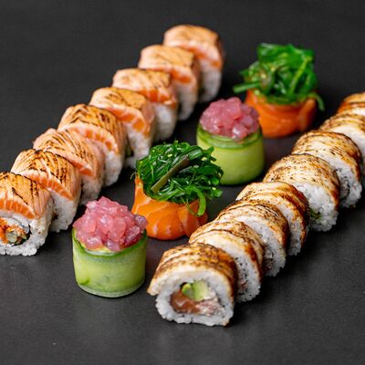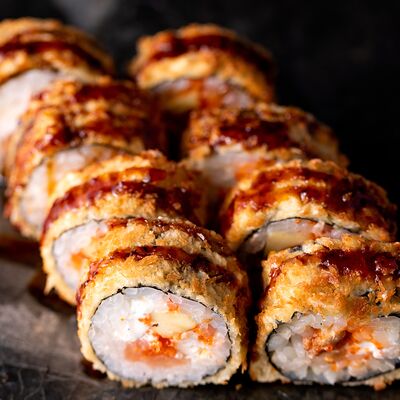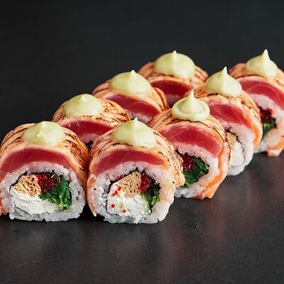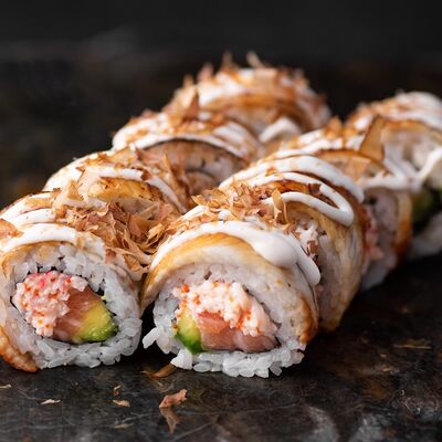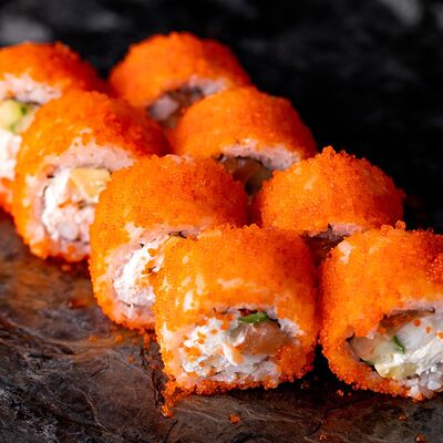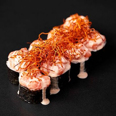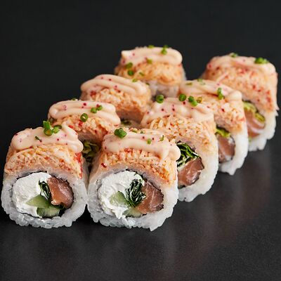 Запечённая Филадельфия, запеченный с креветкой (рис, нори, авокадо, огурец, сыр креметте, шапочка из креветки, сыра и болгарского перца), ролл с тартаром из тунца (8 шт.). Запекание - является способом приготовления ролла и не отражает его температурных параметров