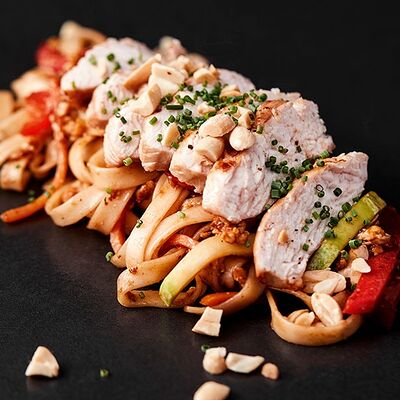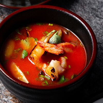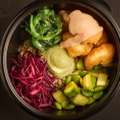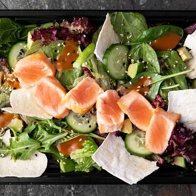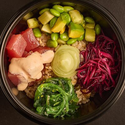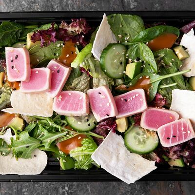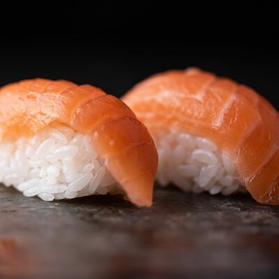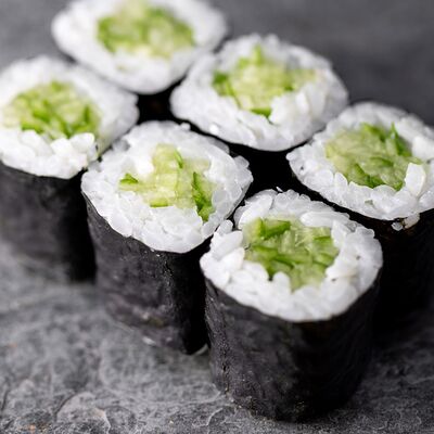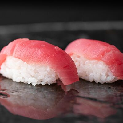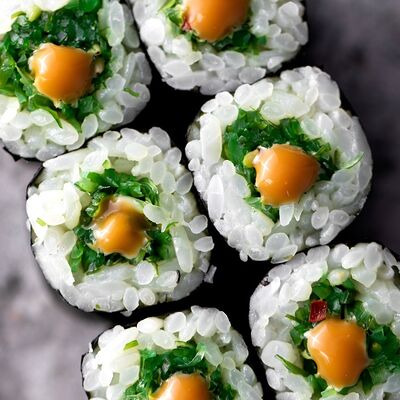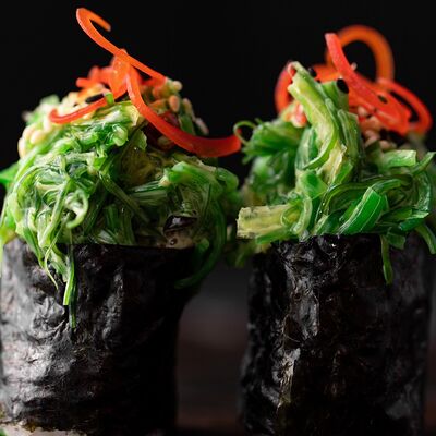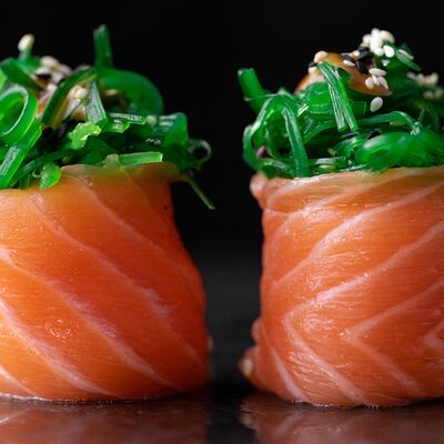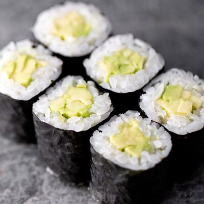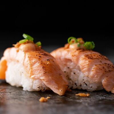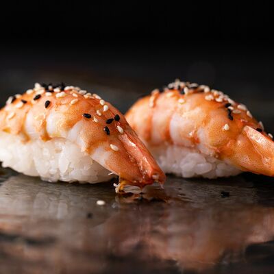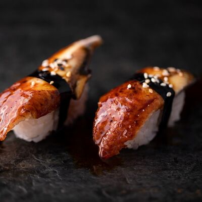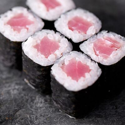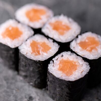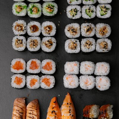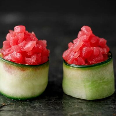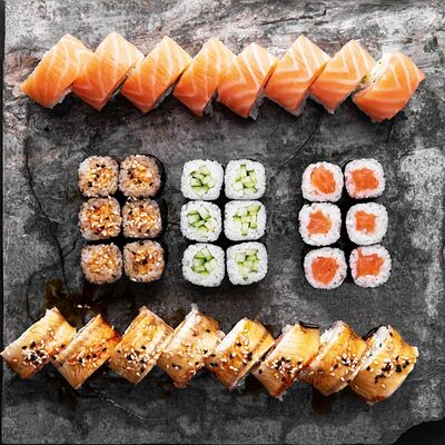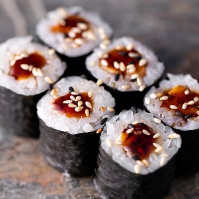 Запечённая Филадельфия, запеченный с креветкой (рис, нори, авокадо, огурец, сыр креметте, шапочка из креветки, сыра и болгарского перца), ролл с тартаром из тунца (8 шт.). Запекание - является способом приготовления ролла и не отражает его температурных параметров