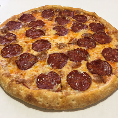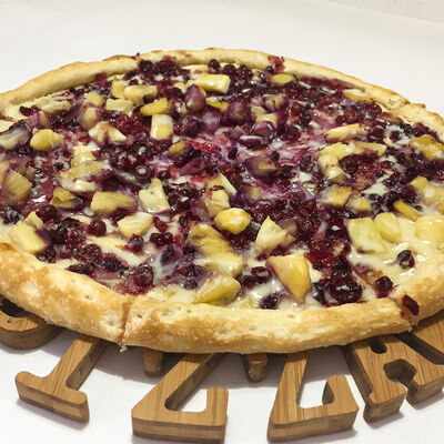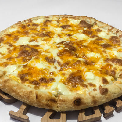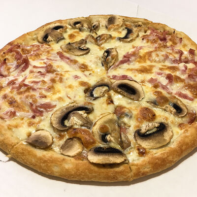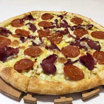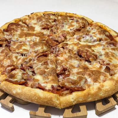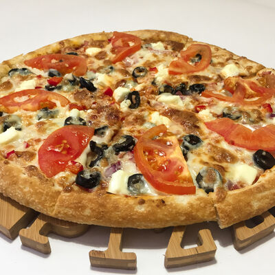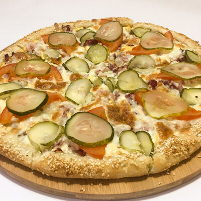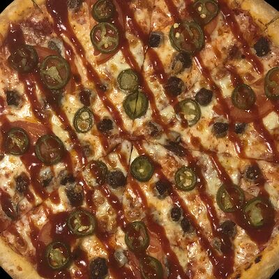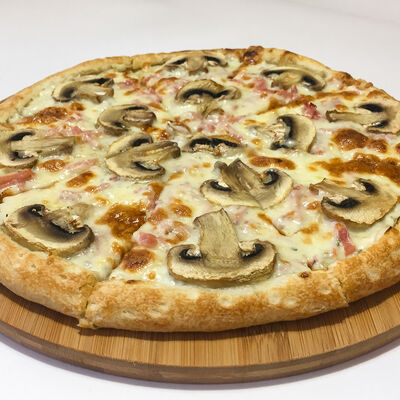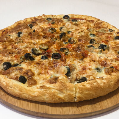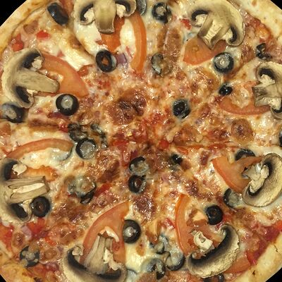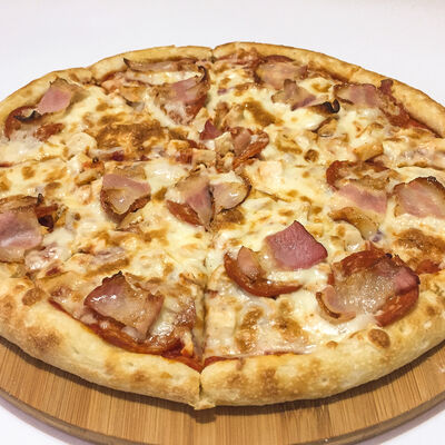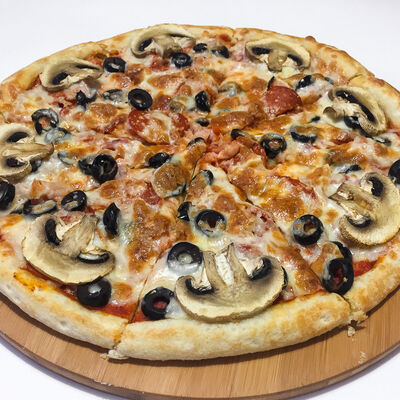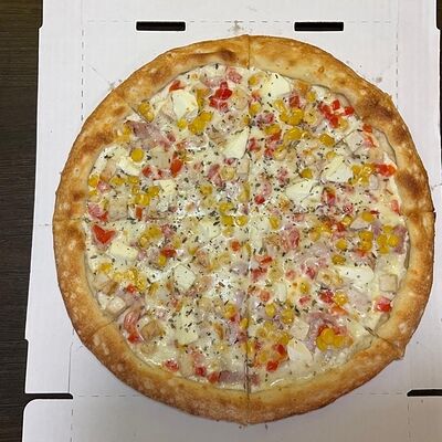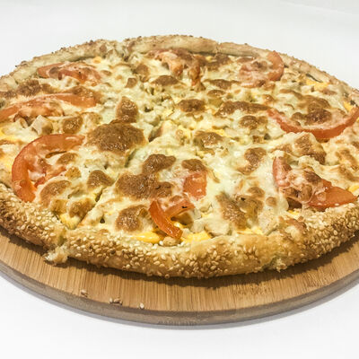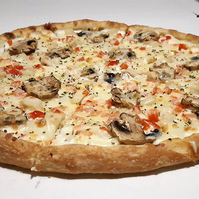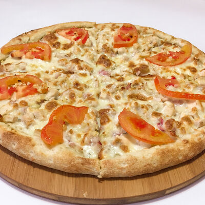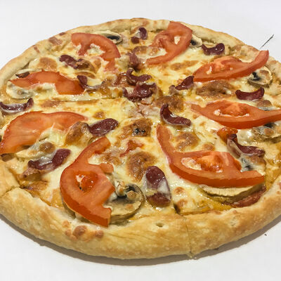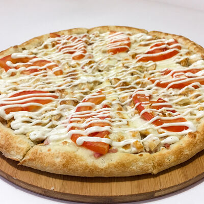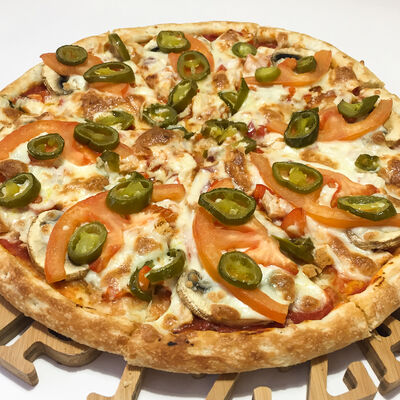 Томатный соус, перчики халапеньо, цыпленок, шампиньоны, сладкий перец, красный лук, томаты, сыр моцарелла