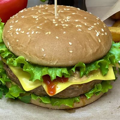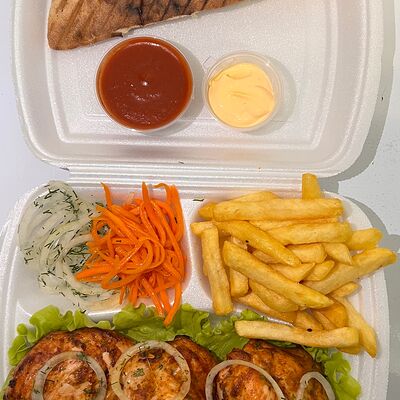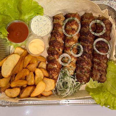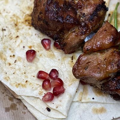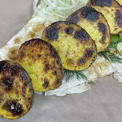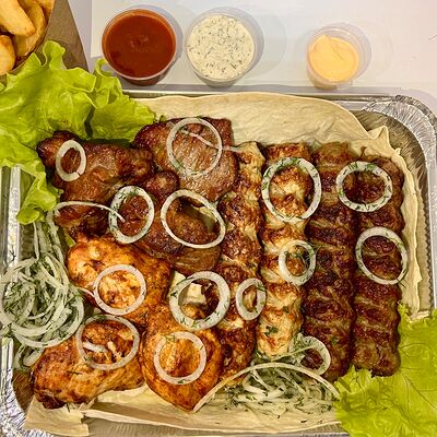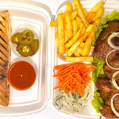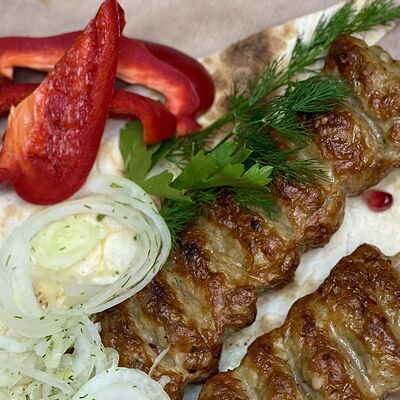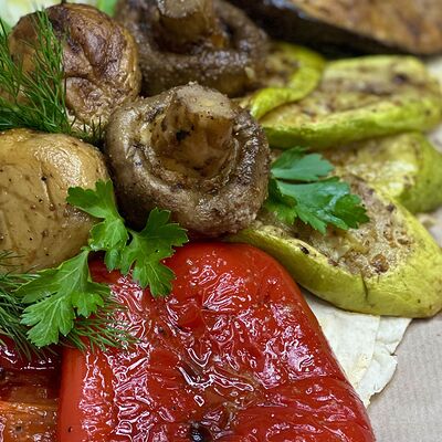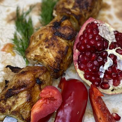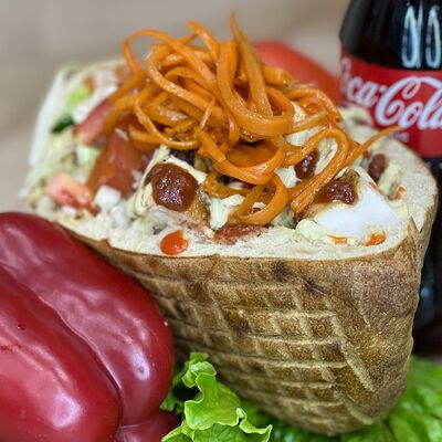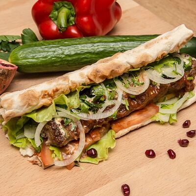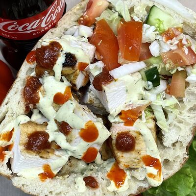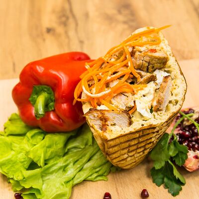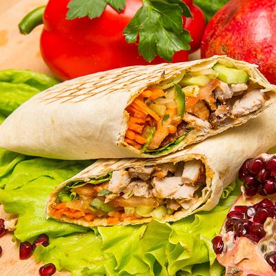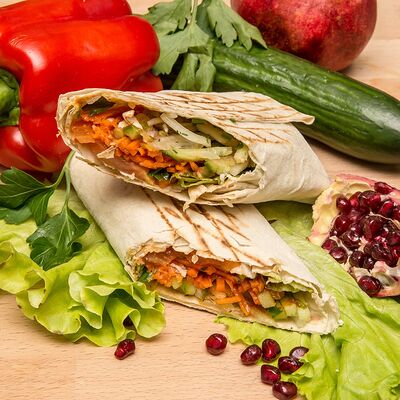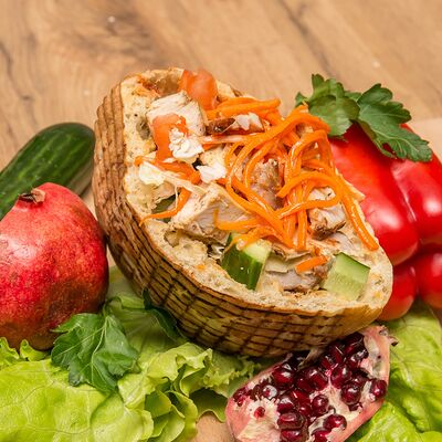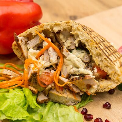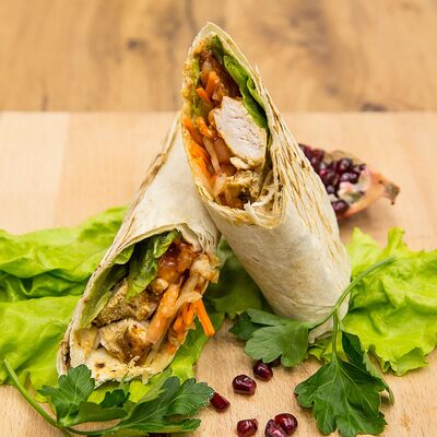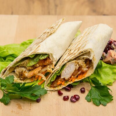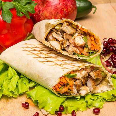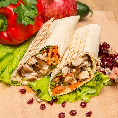 Куриная грудка, приготовленная на углях, свежий салат, помидоры, огурцы, маринованный лук с зеленью, морковка по-корейски, пшеничный лаваш. Заправлена чесночным и томатным соусом ( В составе имеется черный перец)