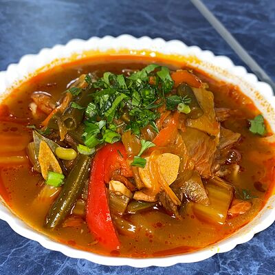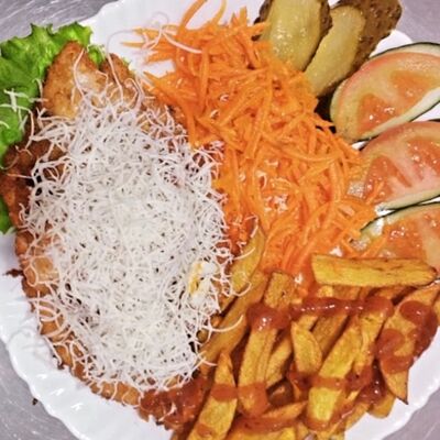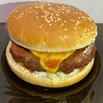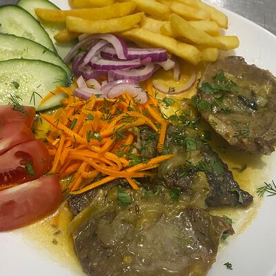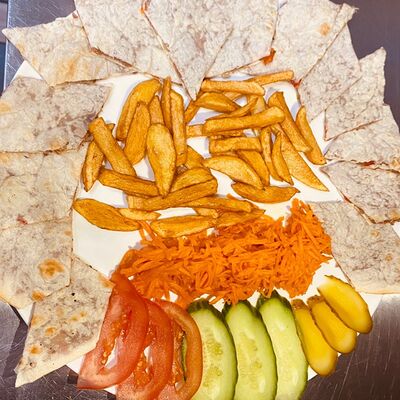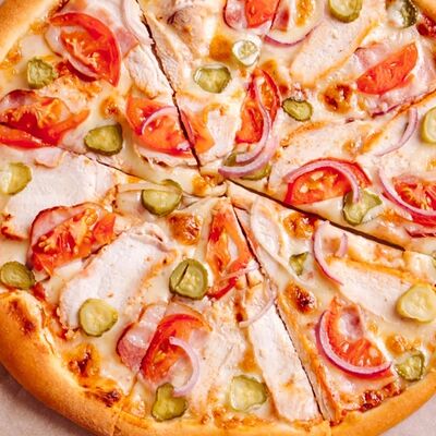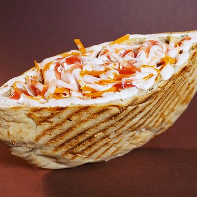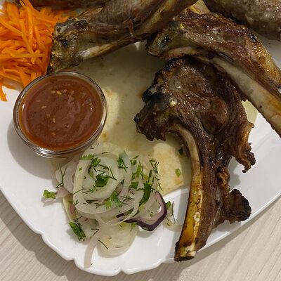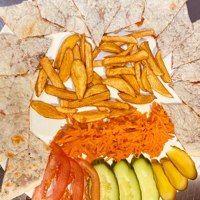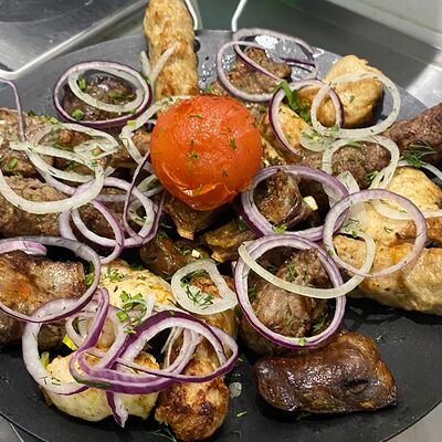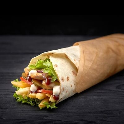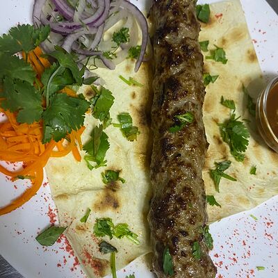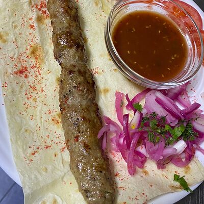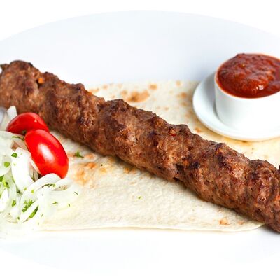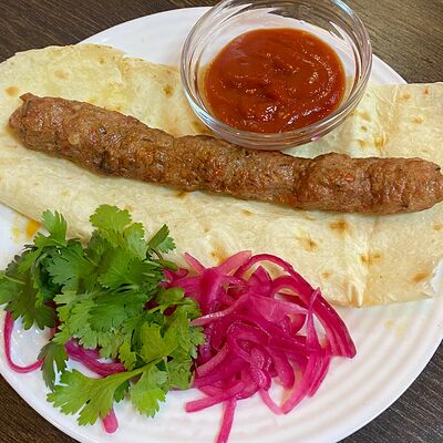 Тонкий лаваш, люля-кебаб из говядины, лук маринованный, свежие огурцы и помидоры, фирменный соус