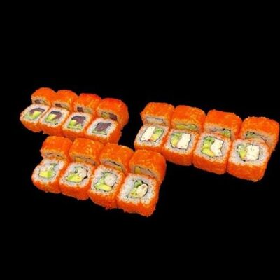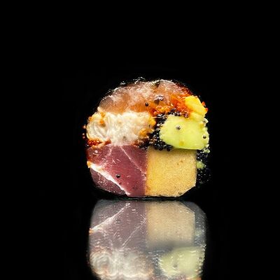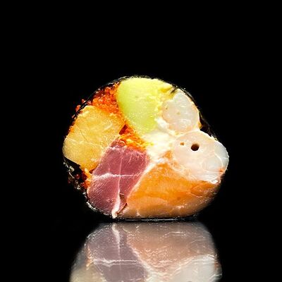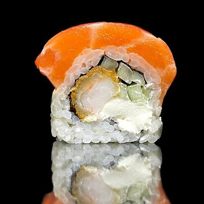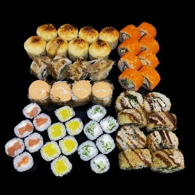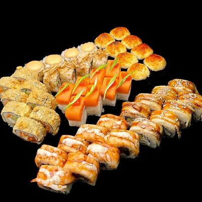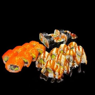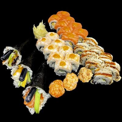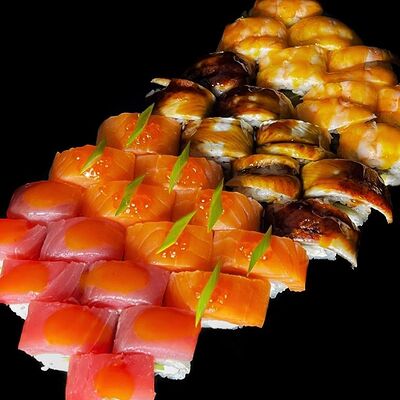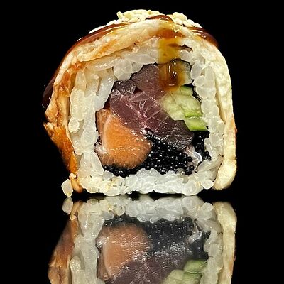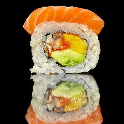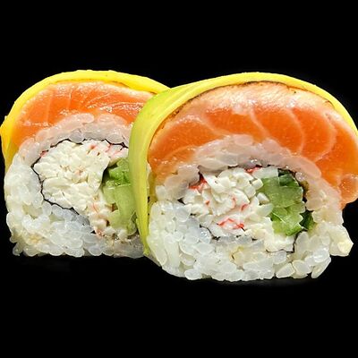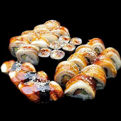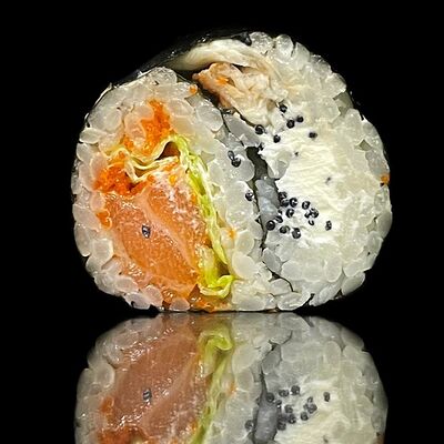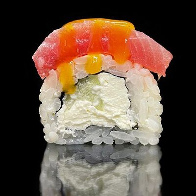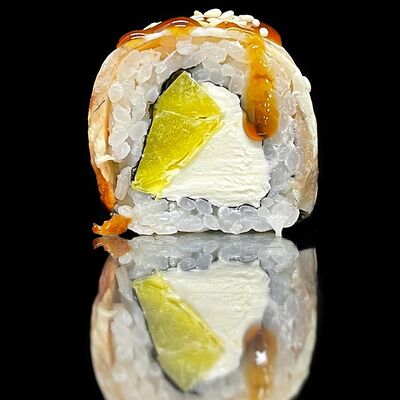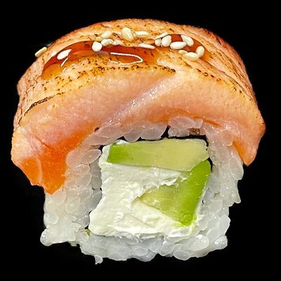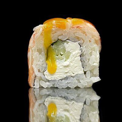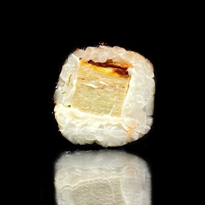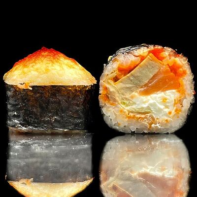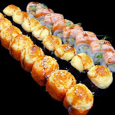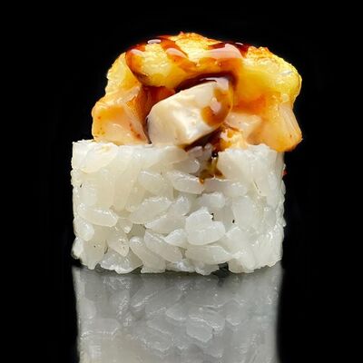 Лосось, сыр, омлет тамаго, соус унаги, соус спайси, рис, нори, сыр пармезан