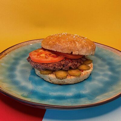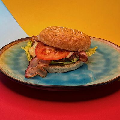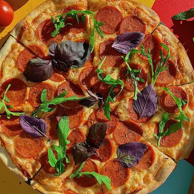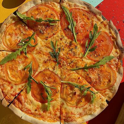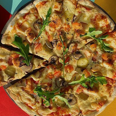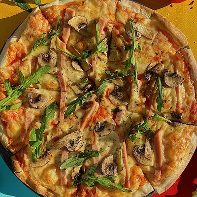 Основа, соус томатный, сыр, огурчик маринованный, куриное филе, бекон, шампиньоны, томаты (25 см)