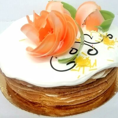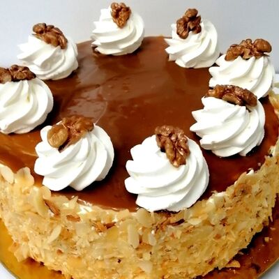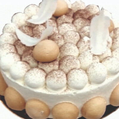 Молочный бисквит с кофейно-коньячным сиропом, взбитые сливки и сливочный сыр маскарпоне придают торту легкость и элегантность