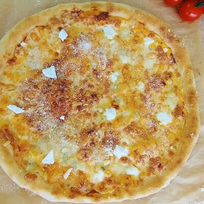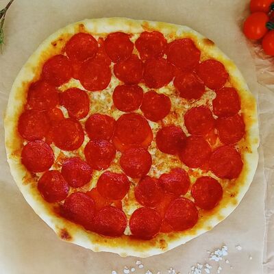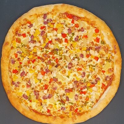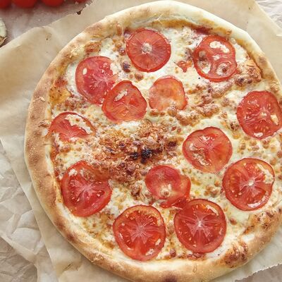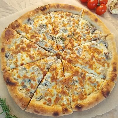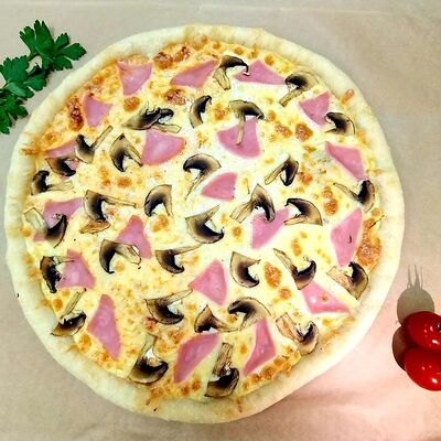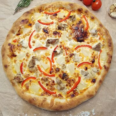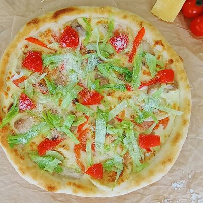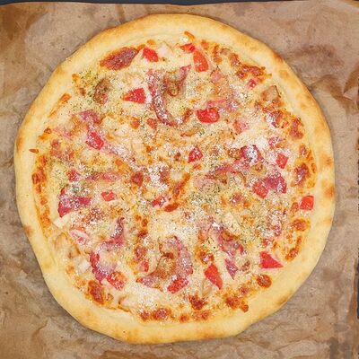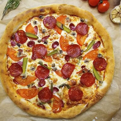 Нежное тесто, колбаски пепперони, куриные колбаски, свежие томаты, сыр моцарелла, корнишоны, шампиньоны (33 см)