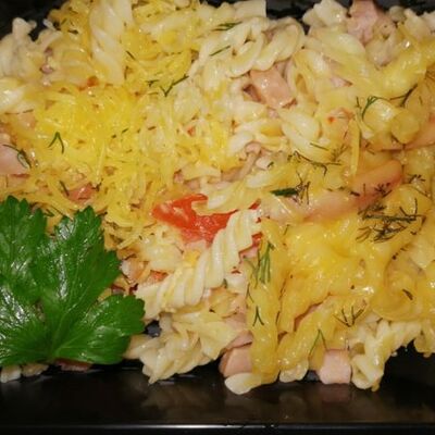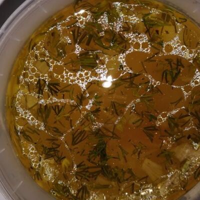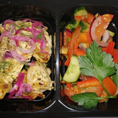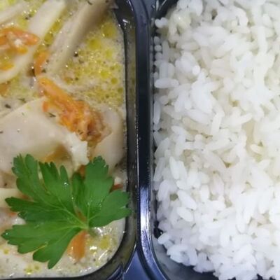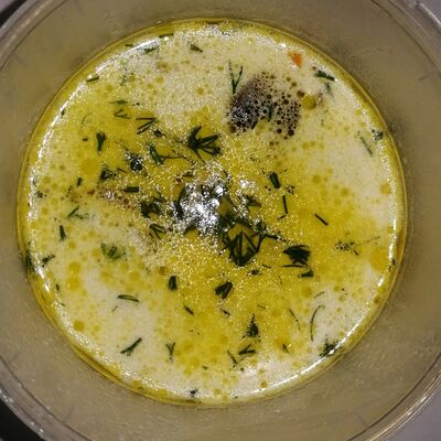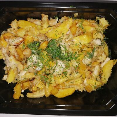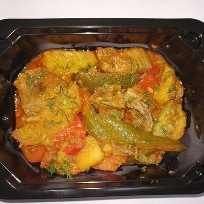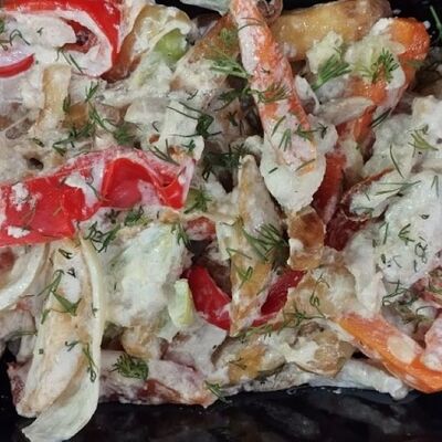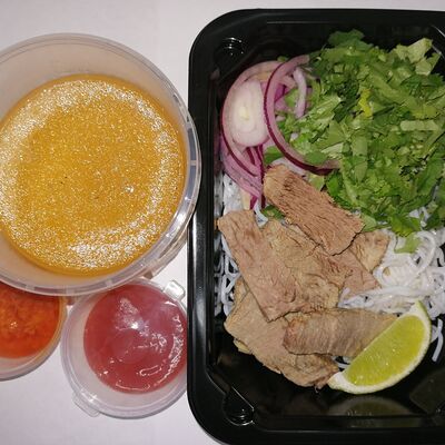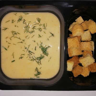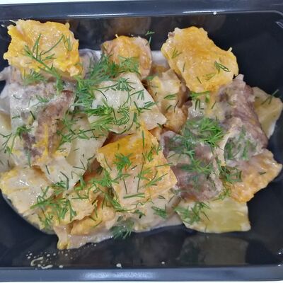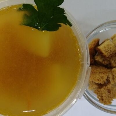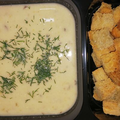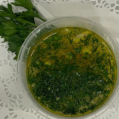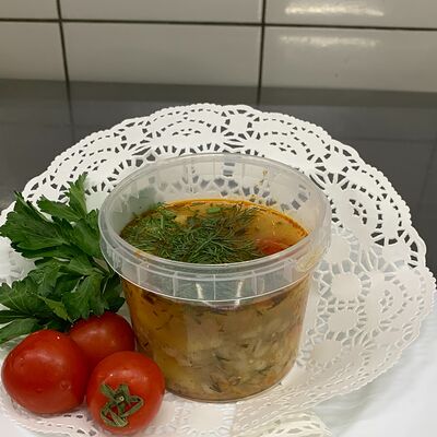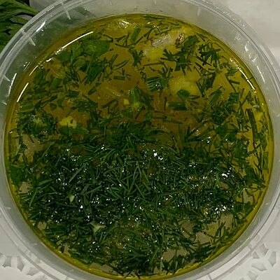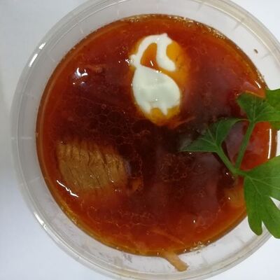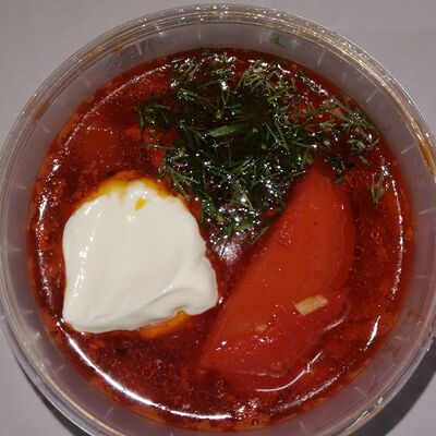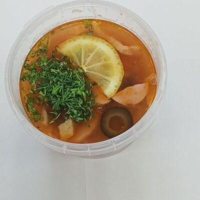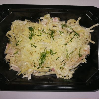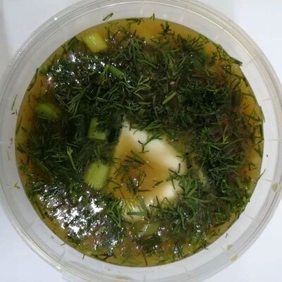 Бутилированный квас, ветчина, отварной картофель, свежие огурчики, яйцо, лук зеленый, свежая зелень. Сметана или майонез по желанию заказчика