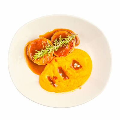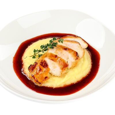 Сочная свиная корейка, обжаренная на гриле, пикантный горчичный соус, картофельные дольки и томаты черри