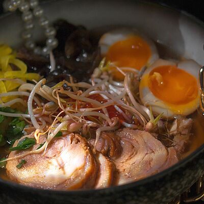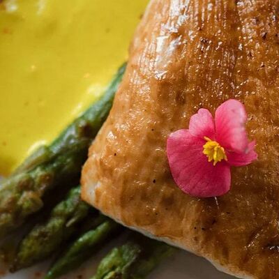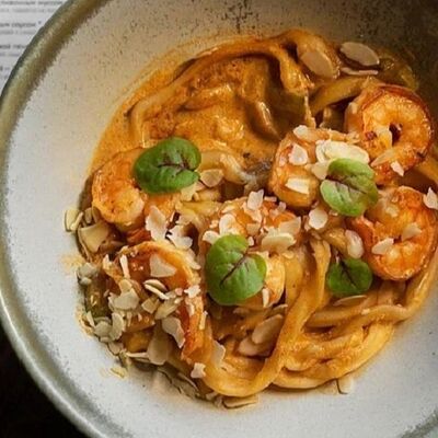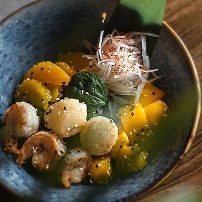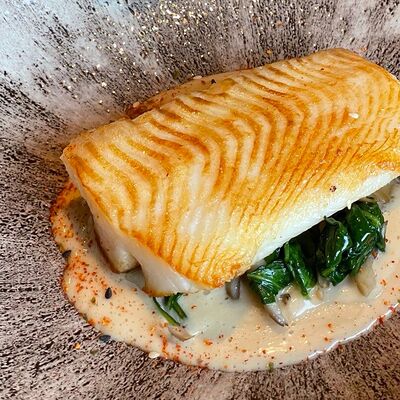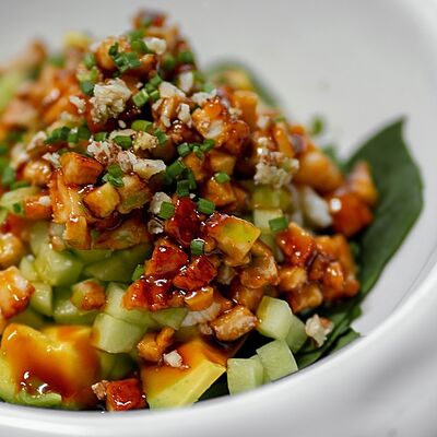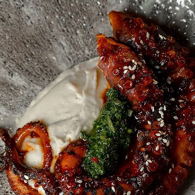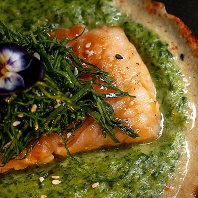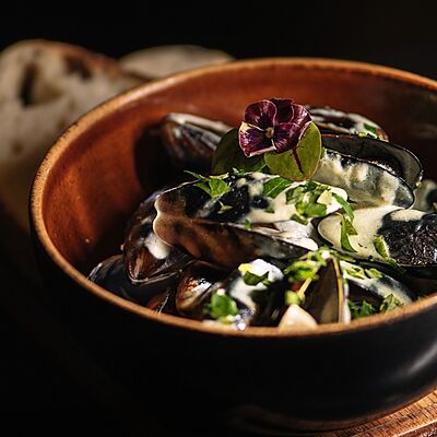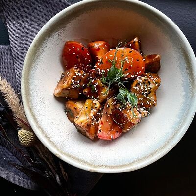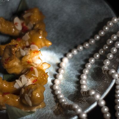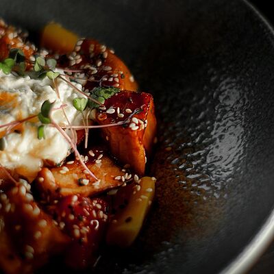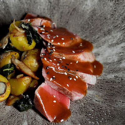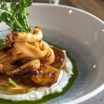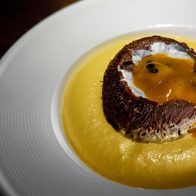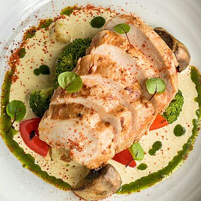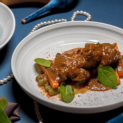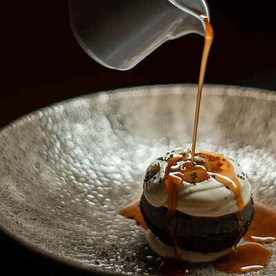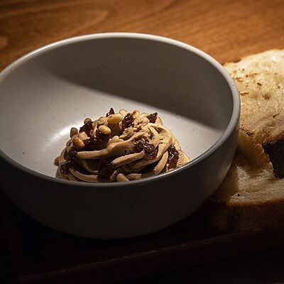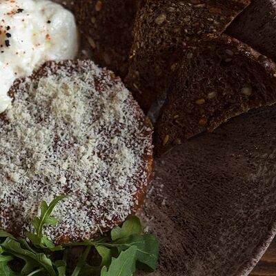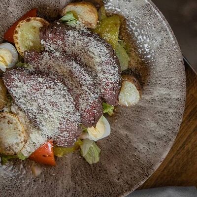 Мелко нарубленная вырезка из телятины смешивается с фирменным соусом, подается с пеной из пармезана