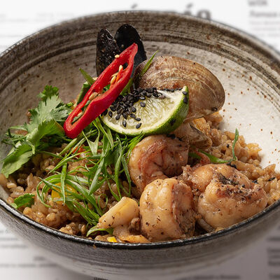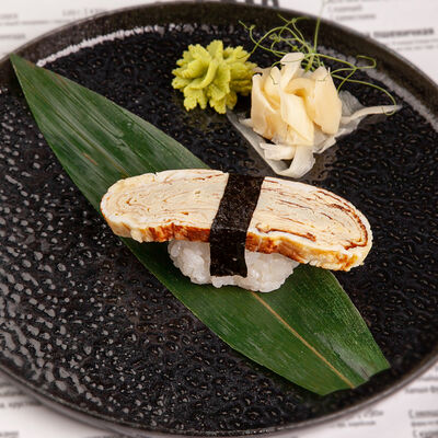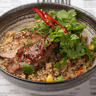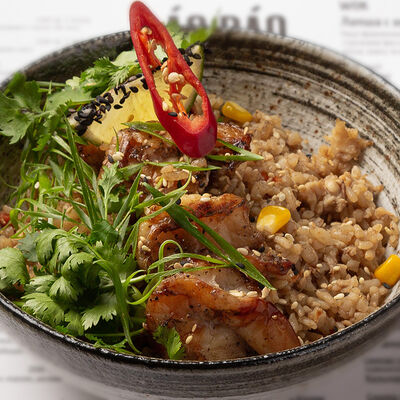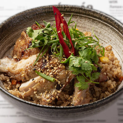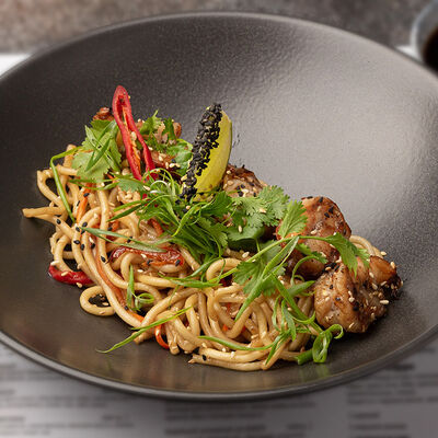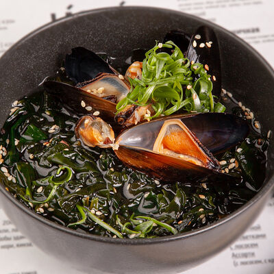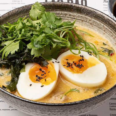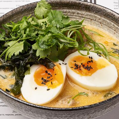Наваристый куриный бульон, свиная грудинка, паста мисо, пшеничная лапша собственного производства, водоросли вакаме, куриное яйцо, молодая кукуруза